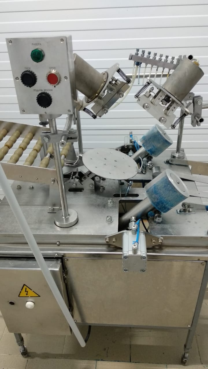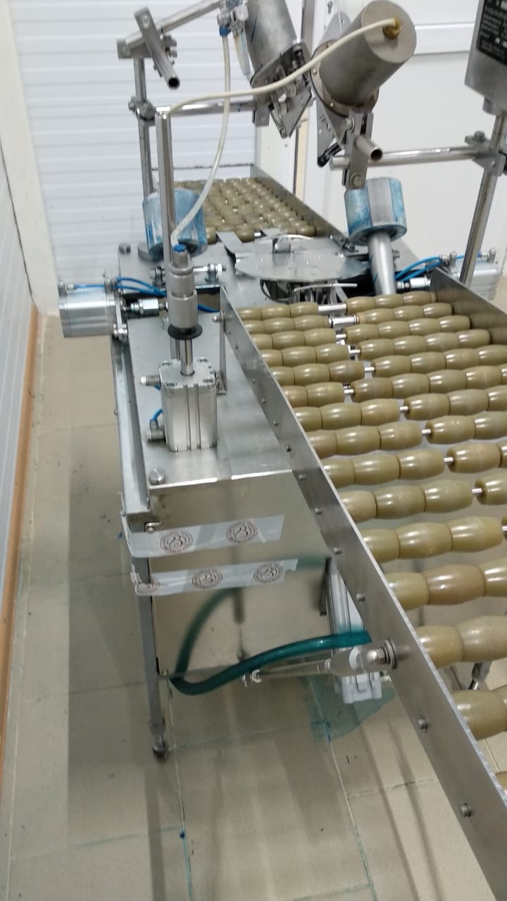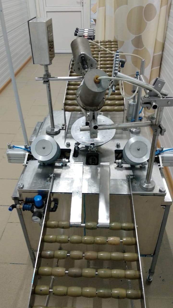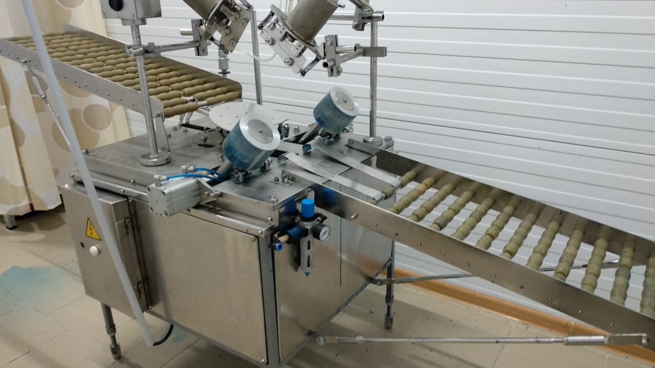 Установка для нанесения латексного покрытия на твёрдые сыры. Это роботизированный транспортер с устройством нанесения покрытия, предназначенное для работы с сырами в форме низкого цилиндра со слегка выпуклой боковой поверхностью и округлыми гранями.