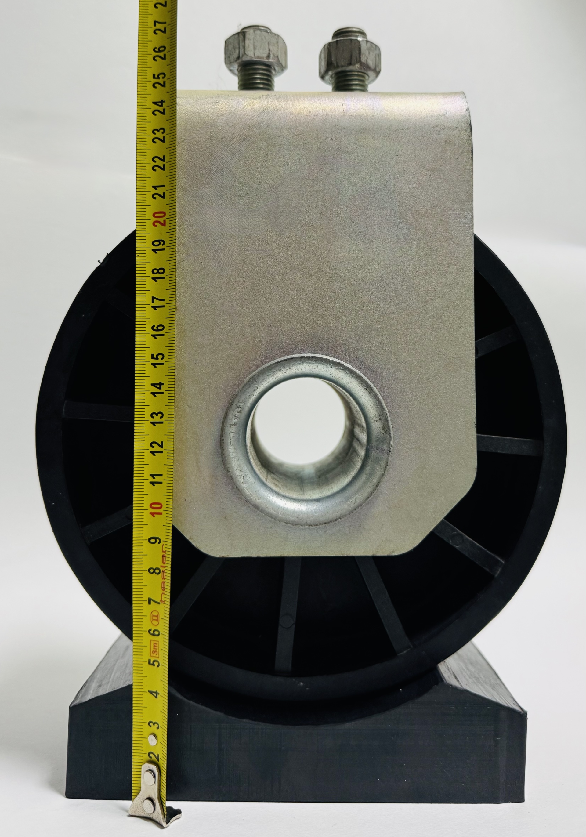 Конструктивно форма виброопоры для трансформаторов имеет широкую плоскую установочную поверхность и подобранную выемку (рабочую окружность) под ролик радиусом скругления под самые распространенные диаметры и ширину выкатных катков / роликов трансформаторов зарубежного и отечественного производства.