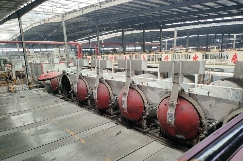 4. Секция автоклавирования. Данный этап является самым важным, именно в автоклаве, за счет воздействия разогретым до ~190 градусов паром, достигается высокая прочность, в отличии от других типов блоков. При автоклавировании создается специальная кристаллическая структура в материале, которой и обусловлена высокая прочность;