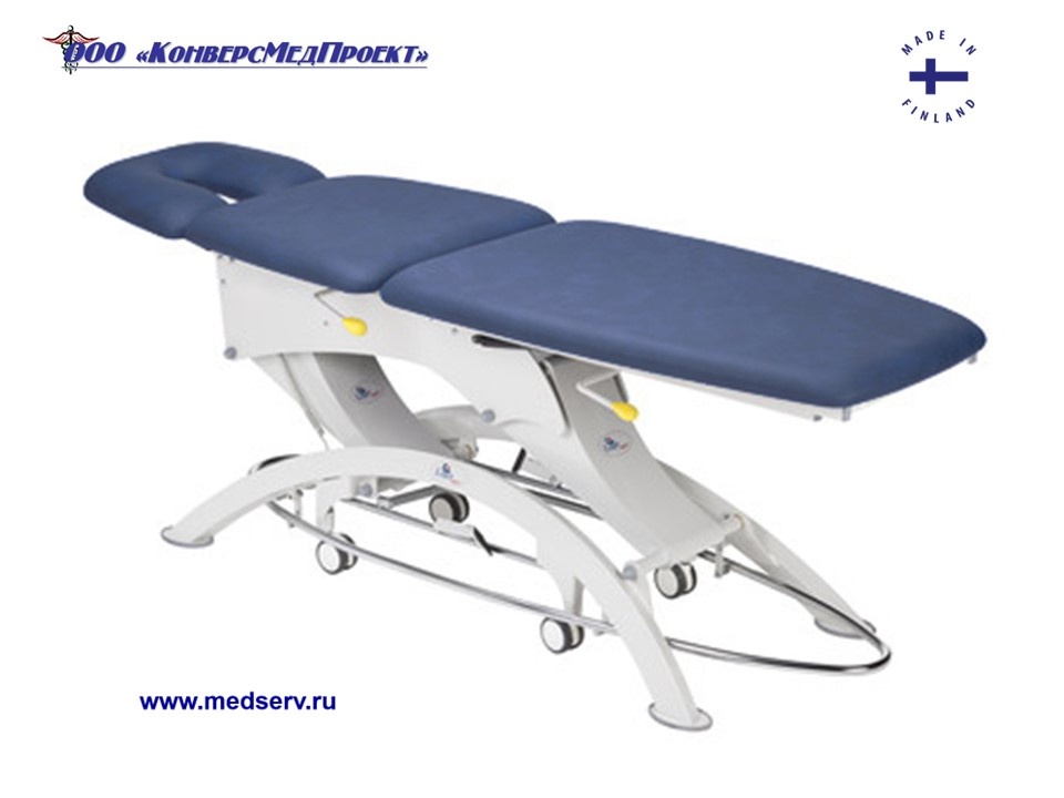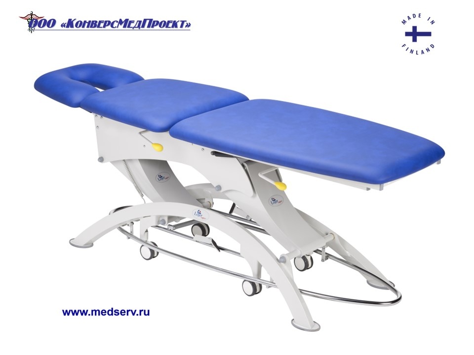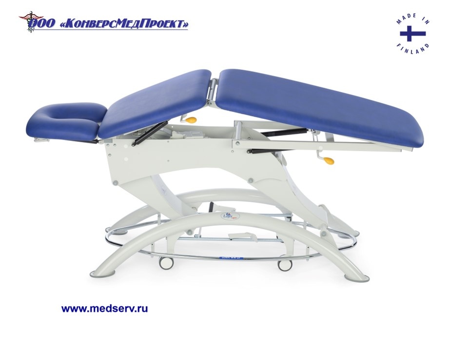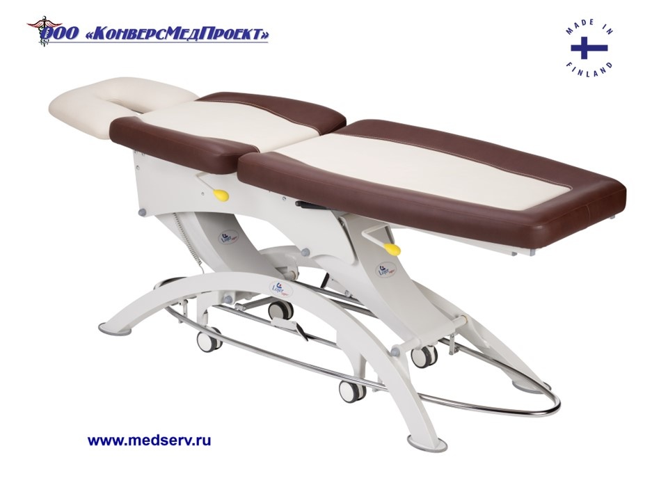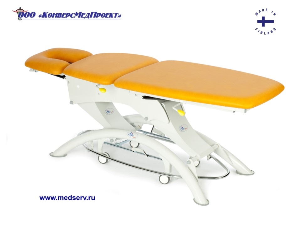 Высота ложа регулируется с помощью ножной педали посредством электропривода, что высвобождает руки врача.