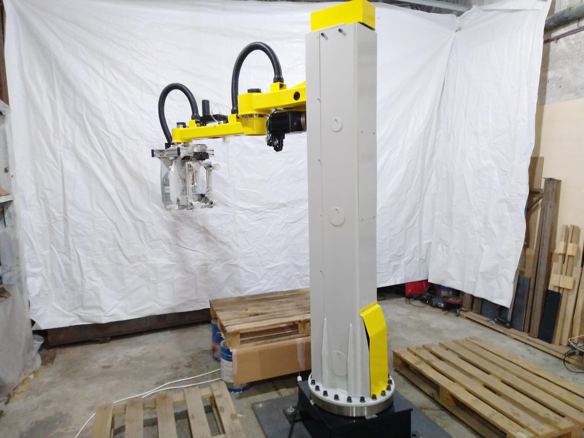Предназначен для работы в составе линий разлива и упаковки воды (и любых других жидкостей) на конечном этапе - перенос упакованной тары и установка на паллету по алгоритму.