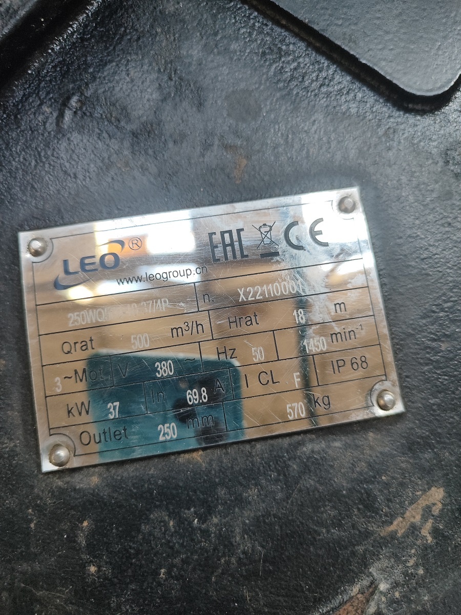 1) насос дренажный погружной канализационный LEO 250WQ500-18-37/4P ( производительность до 930м.куб.час., 37квт., 570кг.),Область применения :