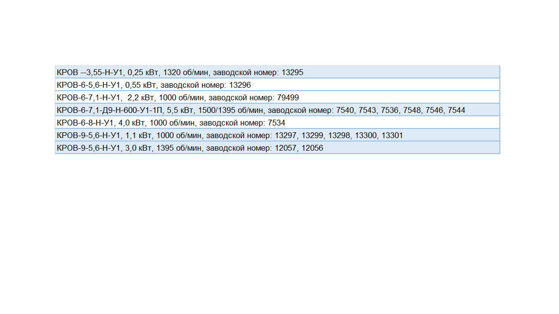 | КРОВ-9-5,6-Н-У1, 1,1 кВт, 1000 об/мин, заводской номер: 13297, 13299, 13298, 13300, 13301 |