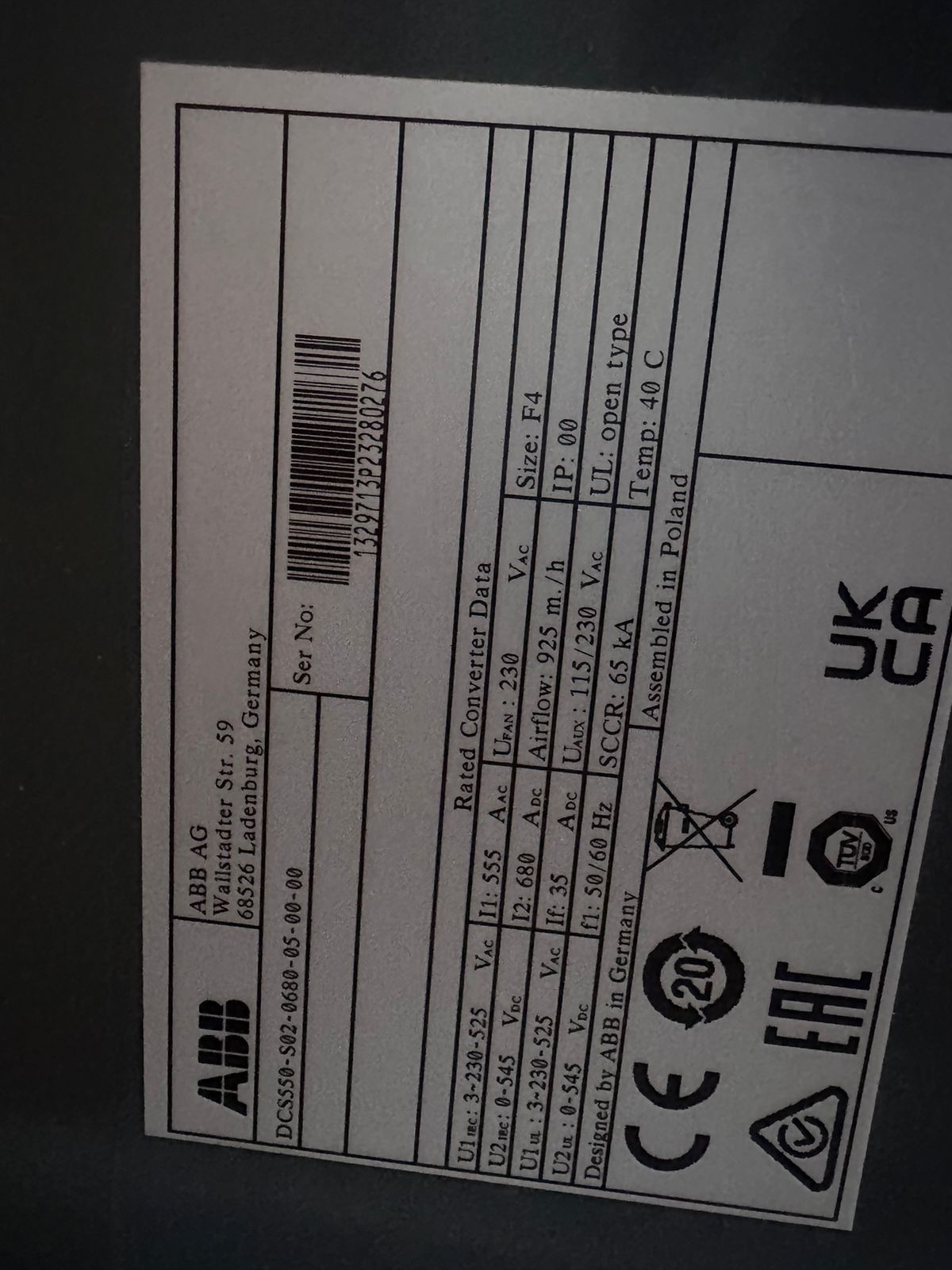 ТЕХНИЧЕСКИЕ ХАРАКТЕРИСТИКИ ТИПОРАЗМЕРА DCS550-S02-0680-05