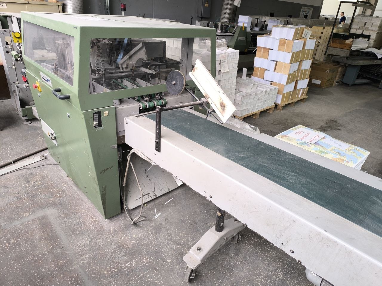 Вкладочно - швейно - резальный автомат. В отличном состоянии. Комплектация: количество карманов 4; самонаклад обложки, + возможность наброса вручную. Швейных голов 4шт. Трёхножевая резка. Форматы: минимальный - 75х140мм. максимальный - 300х360мм. Шаг цепи 17". Максимальная механическая скорость 9000 циклов/час.