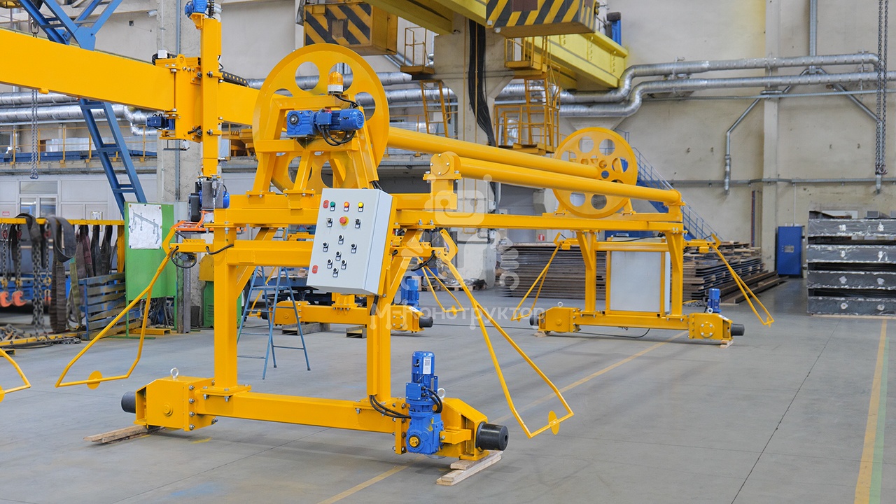 Установка обеспечивает равномерное накрывание свежезаформованных ЖБИ ПВХ-полотном, сохраняя оптимальную влажность и температуру на этапе начального твердения. Это предотвращает пересыхание бетона и снижает энергозатраты на прогрев.
