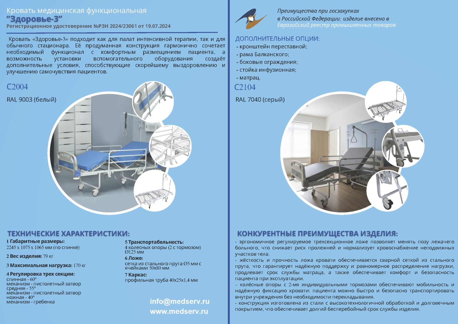 ПОЛНЫЙ КОМПЛЕКТ ДОПОЛНИТЕЛЬНЫХ ПРИНАДЛЕЖНОСТЕЙ В СТАНДАРТНОЙ КОМПЛЕКТАЦИИ – для обеспечения безопасности и комфорта пациента, а также облегчения усилий персонала по качественному уходу за ним.