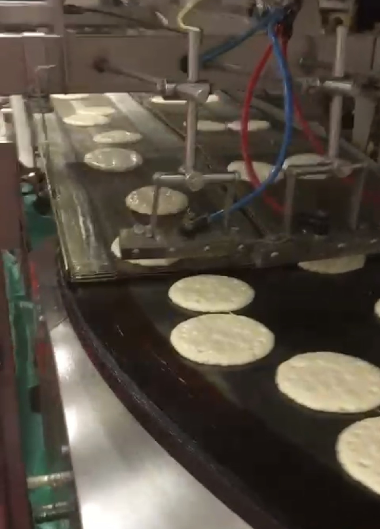 Проволочный транспортер между конфорками/площадками переворачивает блины, готовя их на другой стороне.