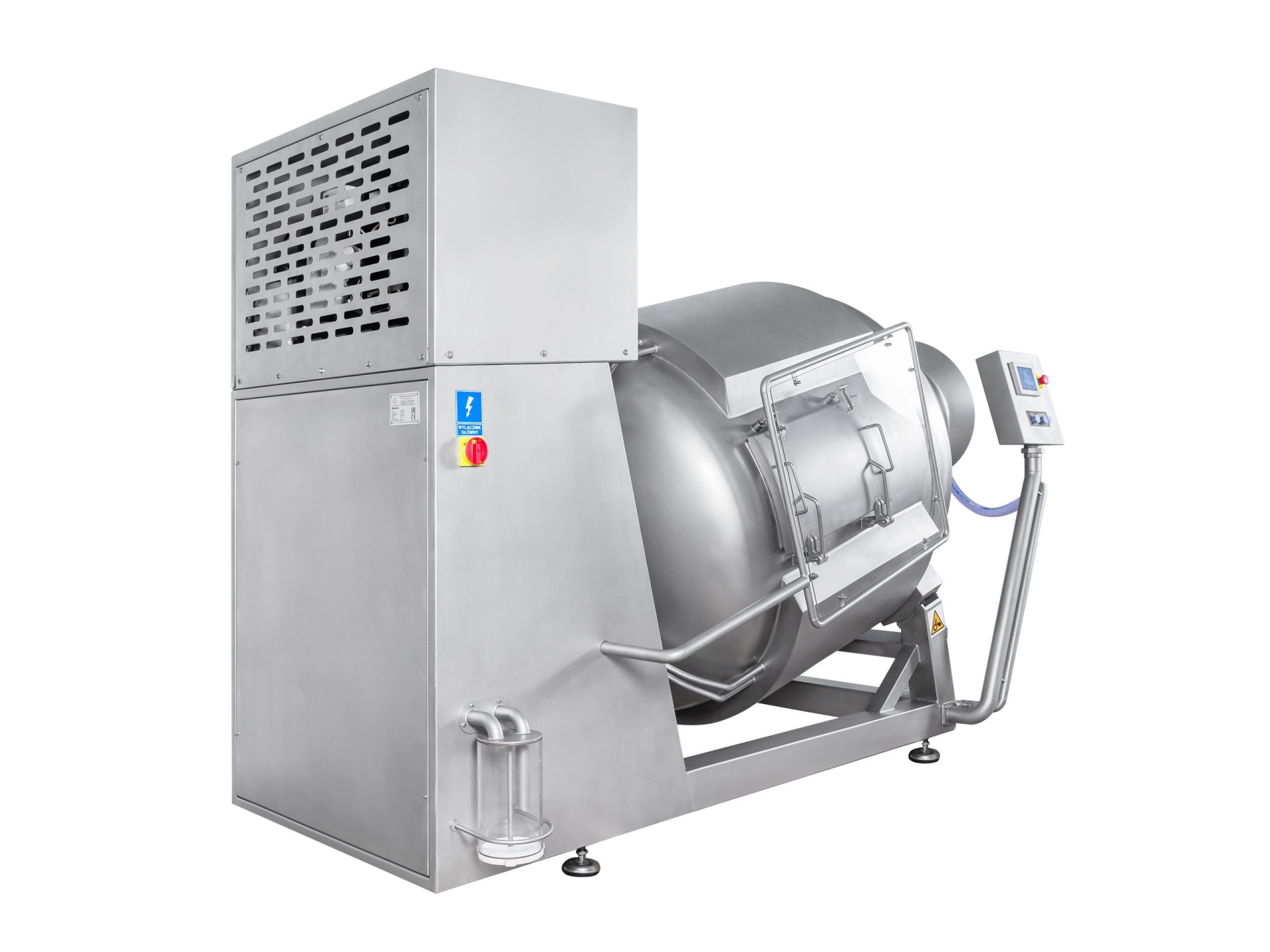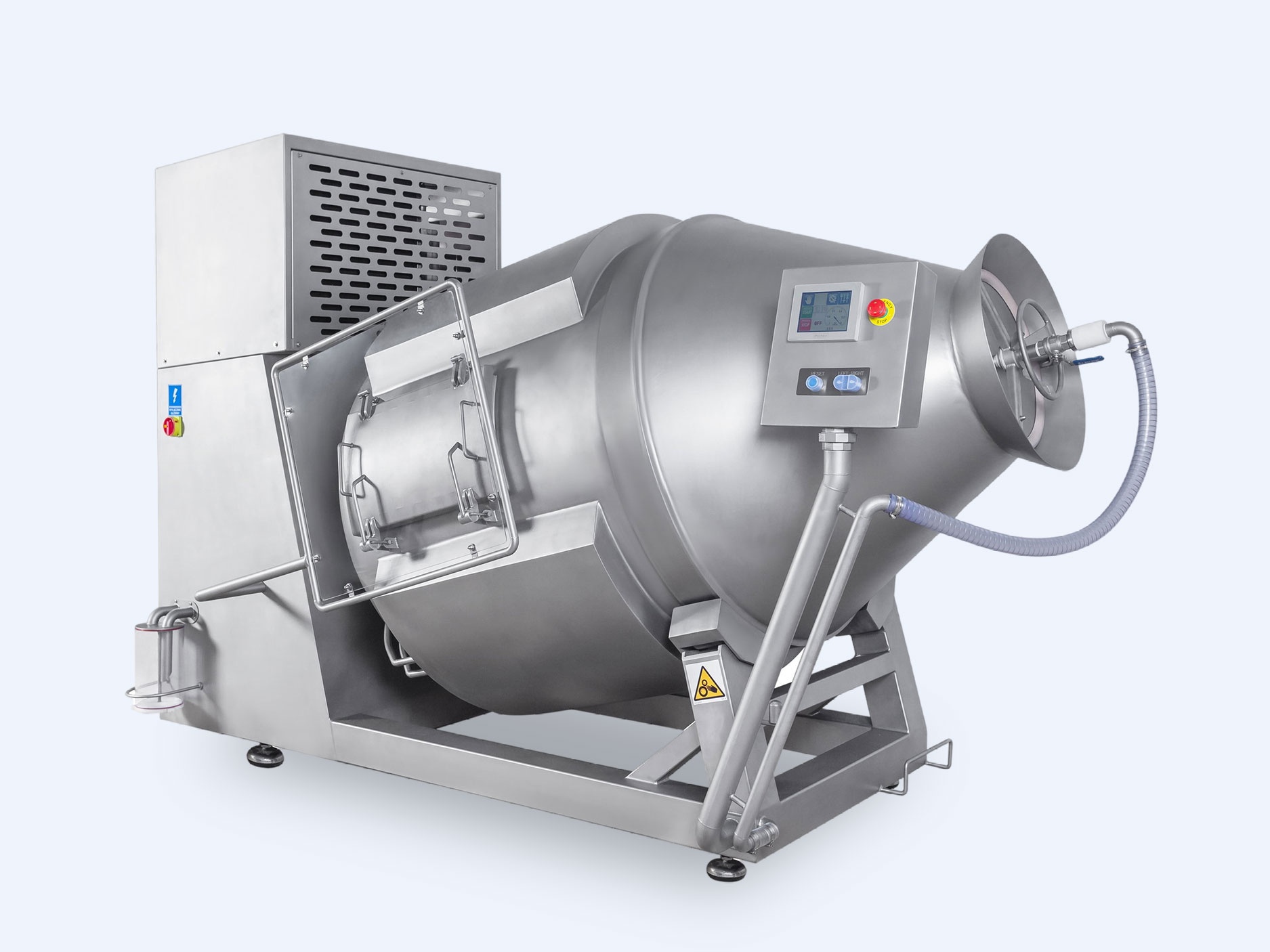 Вакуумный массажер оснащен наклонным барабаном с несколькими спиральными массирующими лопастями, обеспечивающими равномерное распределение продукта и маринада во время работы. Микропроцессорное управление позволяет гибко настраивать параметры, включая скорость вращения барабана, время массирования, паузы и уровень вакуума, что обеспечивает высокое качество обработки разного сырья. Корпус и внутренние детали выполнены из пищевой нержавеющей стали для максимальной гигиеничности и долговечности.