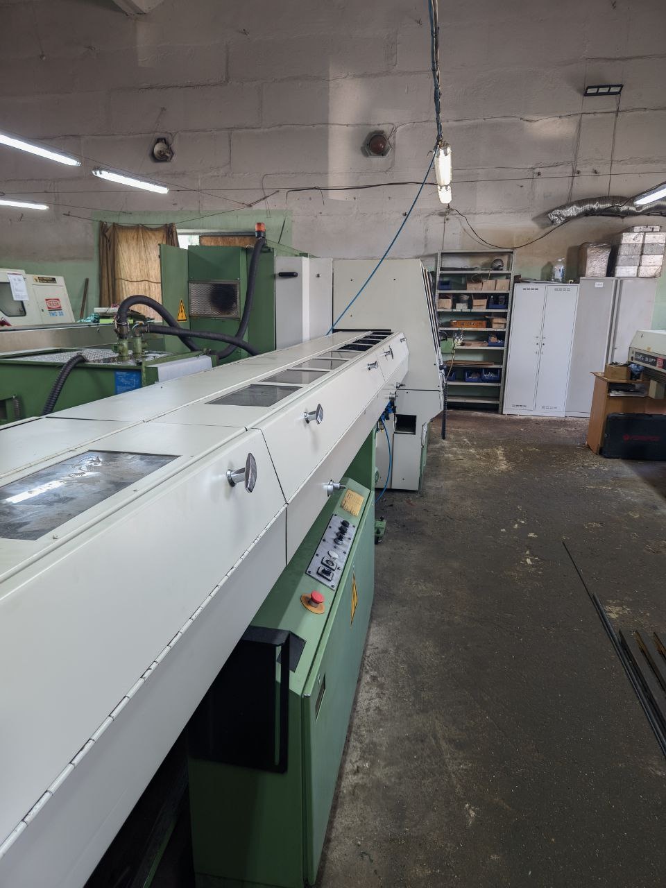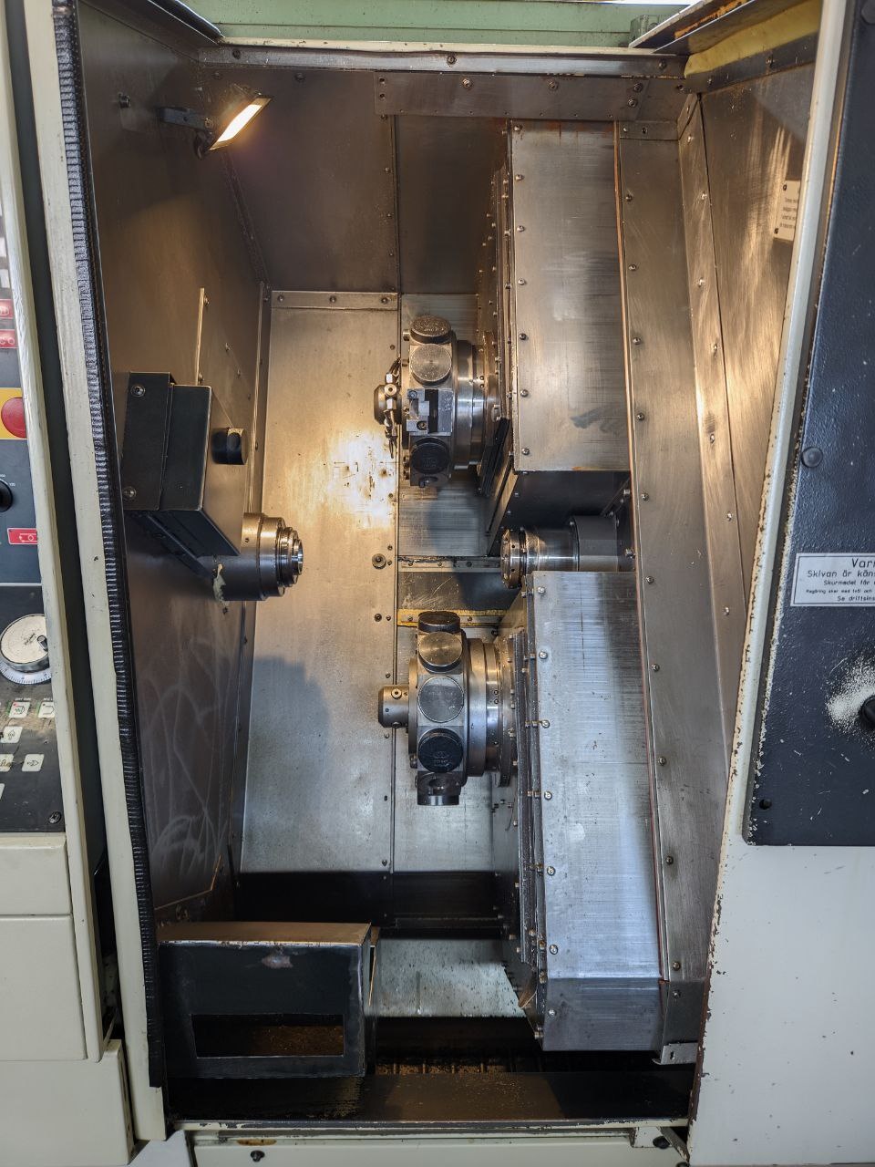 Два шпинделя, пруткоподатчик 4 метра. Два инструментальных револьвера по 12 инструментов. Приводной инструмент и ось Y