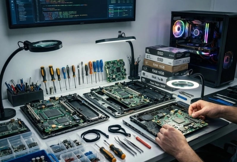 - Замена комплектующих (экраны, клавиатуры, аккумуляторы)