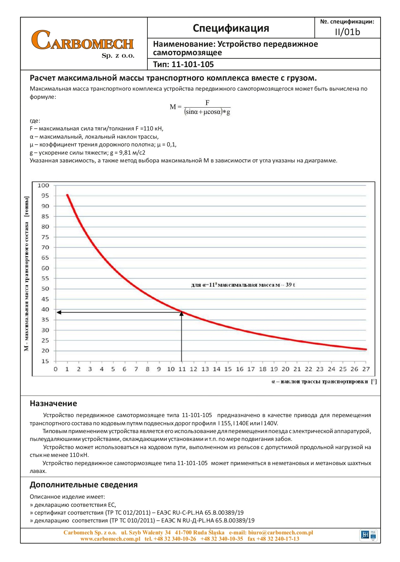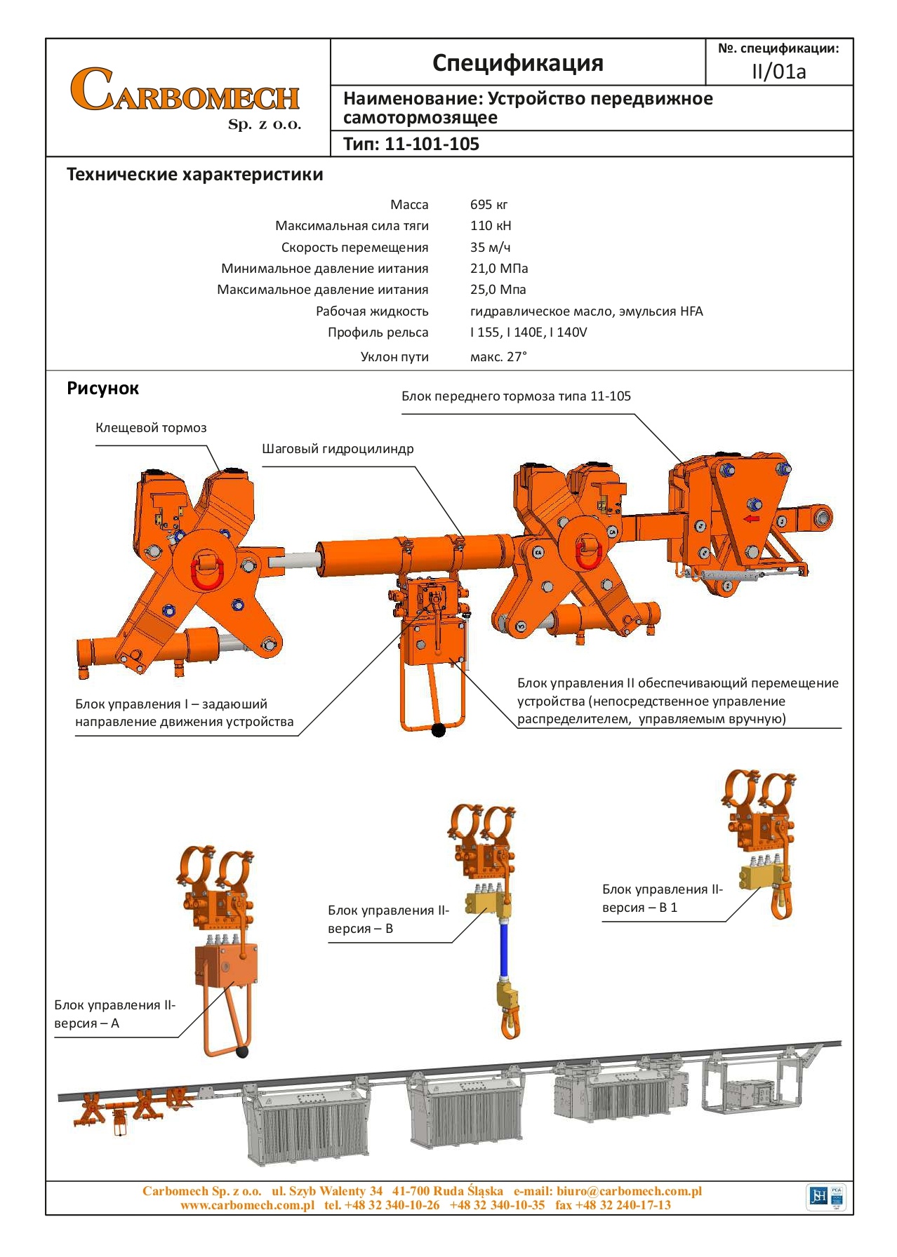 CARBOMECH занимается проектированием и производством транспортных комплектов для перемещения машин и механических устройств, а также электрооборудования, трансформаторных станций, являющихся оборудованием электропоездов, снабжающих лавовые и дорожные комплексы. Несколько лет опыта позволили компании CARBOMECH разработать комплексные решения, включающие как движение по трассе, так и воронки подвесного контакторного оборудования (многоконтактные выключатели), трансформаторные подстанции, а также сети кабелей и шинопроводов перед забоем или за ходом выработки. В зависимости от типа применяемых машин и устройств, а также подбирают компактные станции, контакторные выключатели, трансформаторные подстанции, входящие в состав аппаратуры, опорные конструкции и соединяющие их элементы. Поезд дополнен самоблокирующимся устройством переключения. Система транспортных элементов аппаратного поезда с самоблокирующимся подвижным устройством образует поезд, подвешенный на рельсах подвесной железной дороги. Пример системы электроснабжения лавного комплекса (без трансформаторных подстанций) Типовой поезд может состоять из следующих элементов: самоблокирующееся устройство переключения типа 20-101 или типа 11-101, адаптированное к размерам поезда и типу маршрута, шлагбаум передний тип 20-105, поддоны типа 1-489 с многоконтактными выключателями, поддоны типа 20-316 с многоконтактными выключателями, поддоны типа 1-488 с контакторными выключателями и комплектами трансформаторные колонны, тележки со стрелами типа 20-364 и типа 20-160 для подвески трансформаторных подстанций мощностью до 1000 кВА, рамы типа 20-324 или 20-325 для подвески трансформатор мощностью выше 1000 кВА, шкафы инструментальные тип 20-351, ·стропы для оборудования тип 20-300, шатуны типа 20-371, кабина для визуализации и контроля горного процесса общий, тележки серии 20-363, задний барьер типа 20-107 в конце комплекта, тележки типа 1-605 со стальными стяжками для подвешивания пучка тросов, идущих от аппаратного поезда к стене, другие вспомогательные элементы, например, для направления, организации и хранения кабелей и шин, а также их принадлежностей. Допустимую массу поезда аппаратов, перемещаемого с помощью самоблокирующегося сдвигающего устройства типа 20-101 или 11-101, следует выбирать в зависимости от угла наклона транспортного пути. Подходят устройства типа 20-101 и типа 11-101. соответственно тяговому усилию 60 кН и 110 кН. Максимальный вес транспортного комплекта, перемещаемого самоблокирующимся передвижным устройством типа 20-101 или типа 11-101, можно рассчитать по формуле Тормозные колодки обеспечивают торможение против внутреннего профиля рельса. Концевой клапан позволяет активировать шагающий привод только после того, как клещевой барьер полностью откроется с помощью управляющего привода. Ходовой привод, действуя с обеих сторон, обеспечивает циклическое перемещение зажимных ограждений в профиле рельса и, таким образом, перемещение самоблокирующегося скользящего устройства вдоль пути. Свяжитесь с нами, мы говорим на русском языке. Тел./ WhatsApp: +(48)733-275-085; Тел.: +(48)660-284-220; Факс: +(48)32240-17-13 CARBOMECH Spółka z ograniczoną odpowiedzialnością ( ООО " Карбомех") Регистрационные данные: NIP 648-10-11-628 REGON 272082837 Отдел маркетинга Святослав Макеев Корпоративный email: s.makieiev@carbomech.com.pl