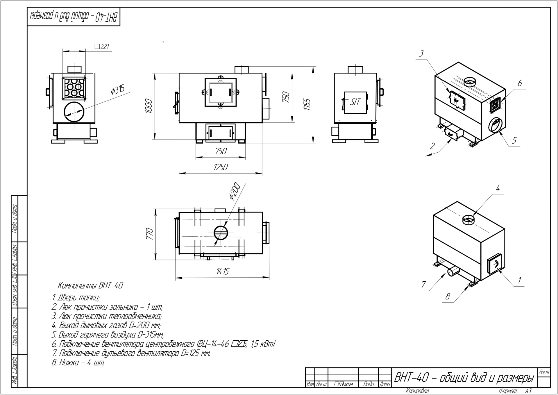 ООО «СИТ-технологии» предлагает чертежи и технологию изготовления с онлайн-консультациями теплогенератора( воздухонагревателя) мощностью 40 кВт, который может использоваться для отопления помещений объемом 450-800 м3, теплиц, а также получения технологического горячего воздуха температурой до 200 гр С для сушильных камер различного назначения. Воздухонагреватель модели ВНТ-40 с длиной топки 750 мм тепловой мощностью до 40 кВт работает на дровах или кусковых отходах деревообработки. Расход топлива составляет 10-12 кг в час. Возможна установка газовой горелки или бункера-загрузчика сыпучего топлива(пеллеты, щепа, опил). Контроль и управление осуществляется релейной автоматикой и датчиками температуры.