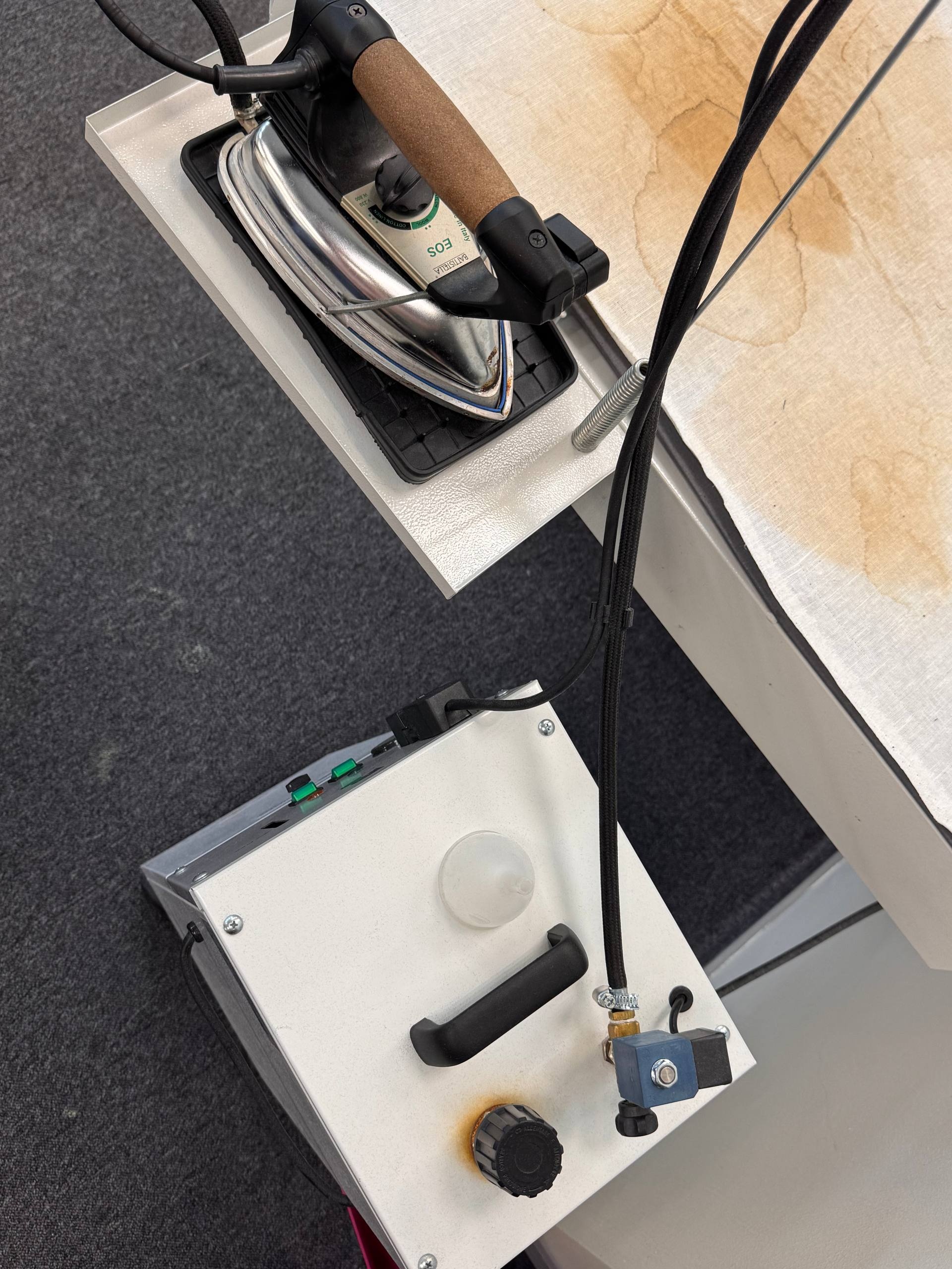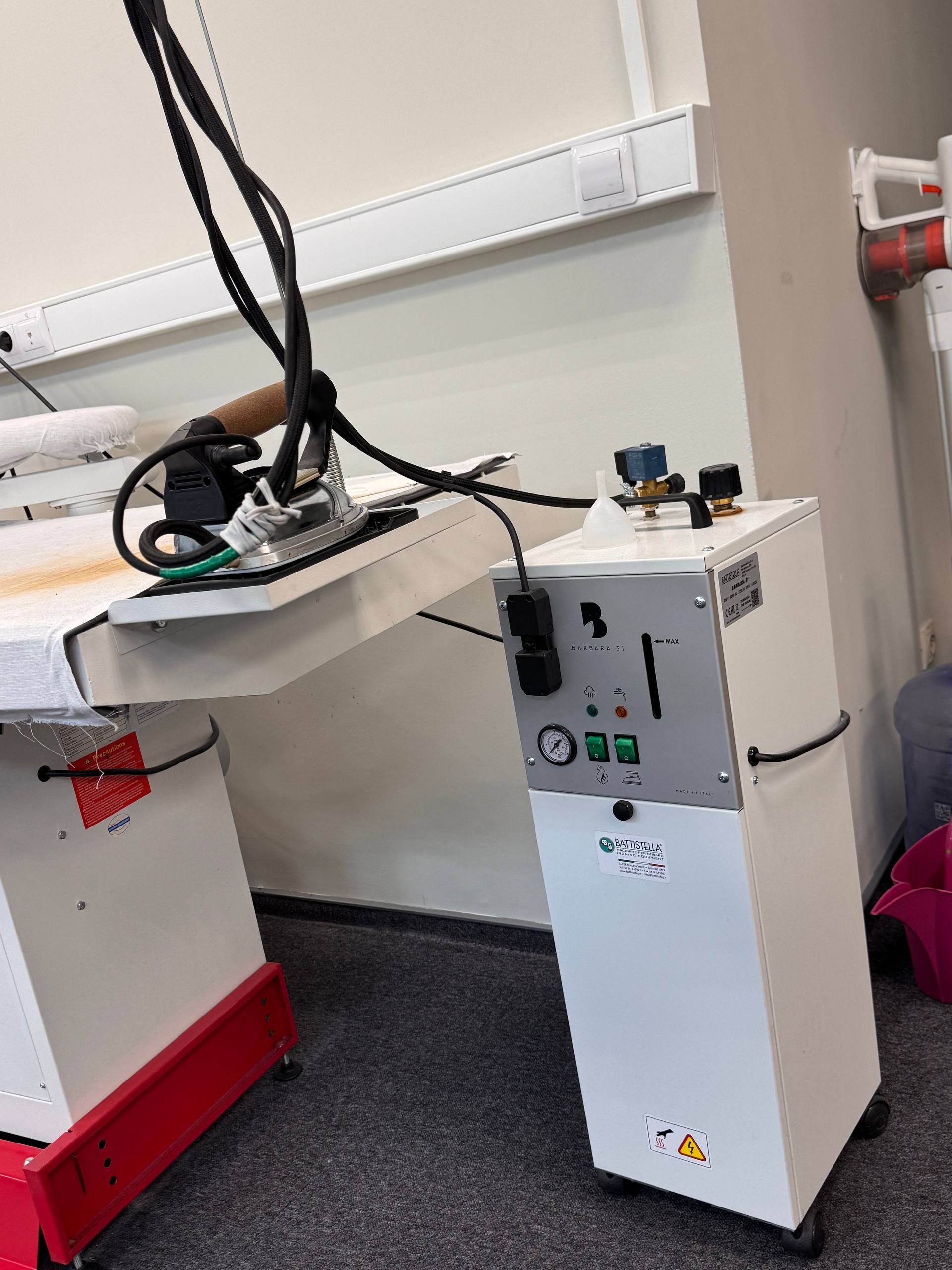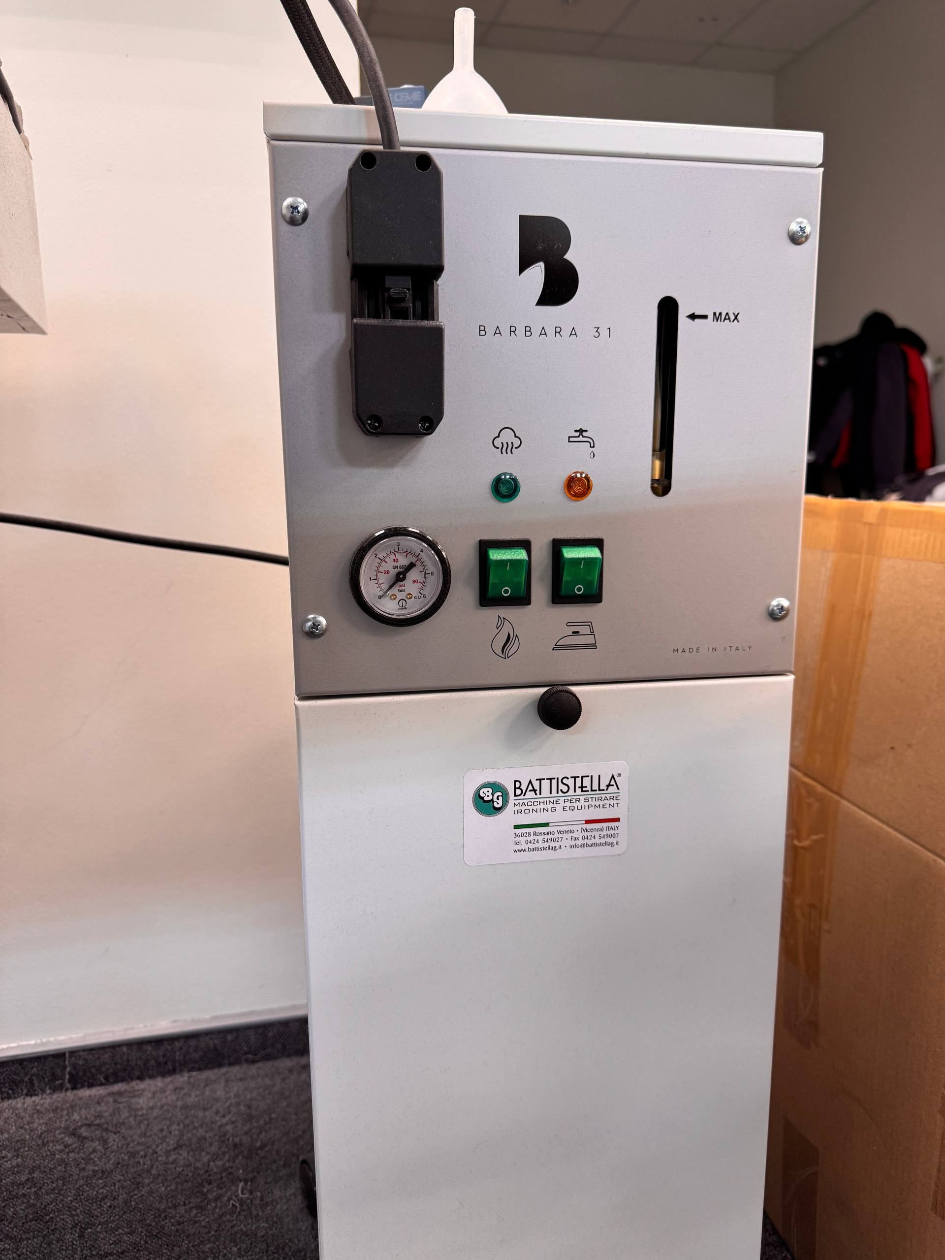Парогенератор с бойлером на 4,5 л и нагревательным элементом из нержавеющей стали для предотвращения накипи. Расположен на тумбе с колесами. Оснащен краном слива для удобной прочистки и манометром Внешнее подключение утюга для удобного переключения на щетку. Время работы - 4 часов. Габариты 25x29x89 см.