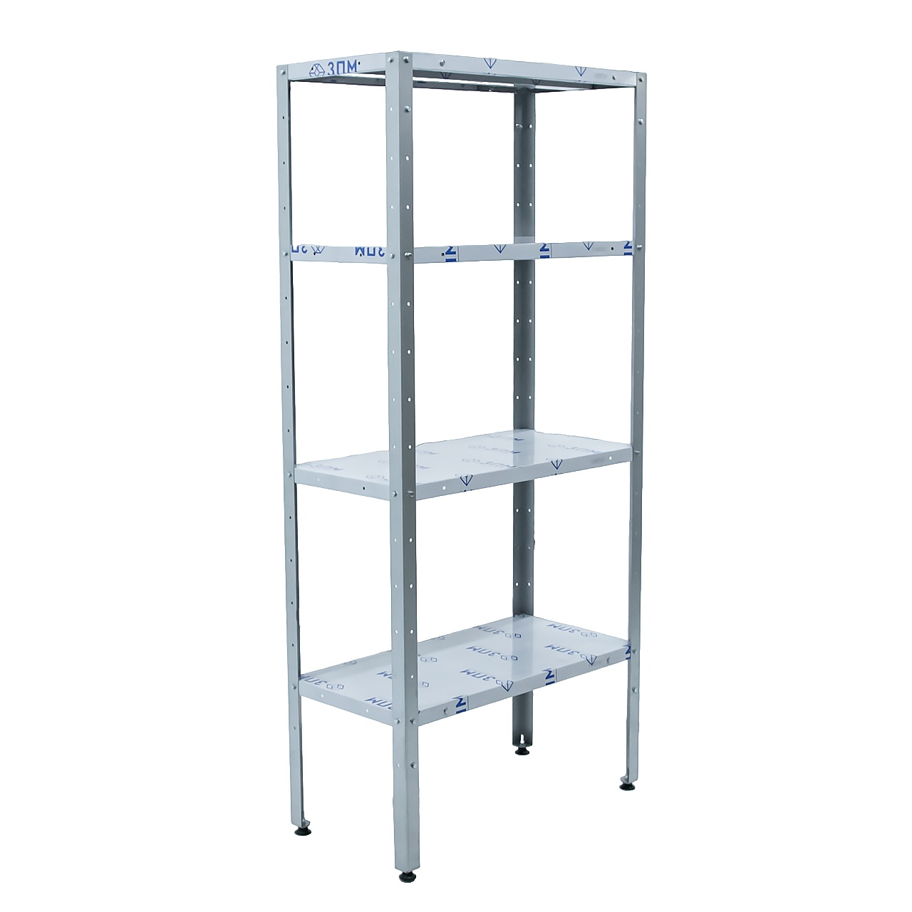 Стеллаж сборно-разборный кухонный с 4 сплошными полками из нержавеющей стали AISI 430, 4 стойками из уголка 40х40мм из оцинкованной стали, шаг регулировки полок 100мм, макс. нагрузка на полку 80кг.