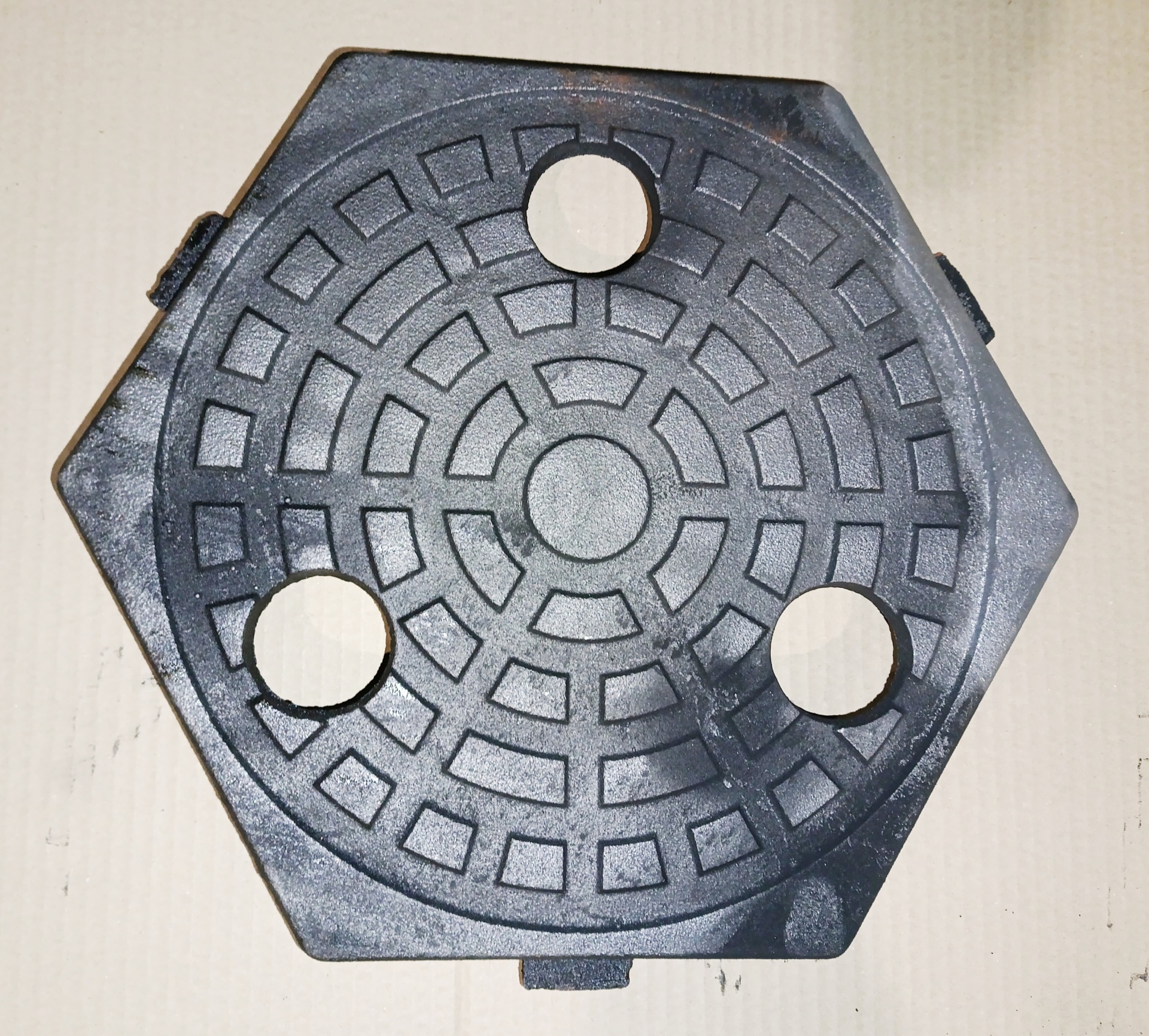 Плитка пола ПП-6Г Л7 (материал – серый чугун марки СЧ18) весом 11 кг имеет ромбообразную форму – шестигранник с шириной между параллельными сторонами равной 335 мм, имеющий 3 отверстия и 3 зацепа для позиционирования плитки относительно других плиток на одном уровне. Предназначена для быстрого монтажа необорудованного пола.
