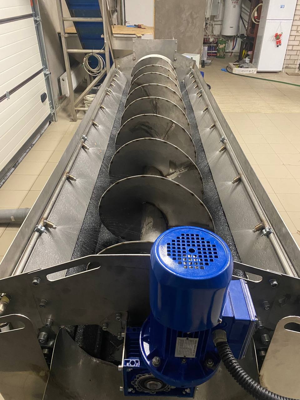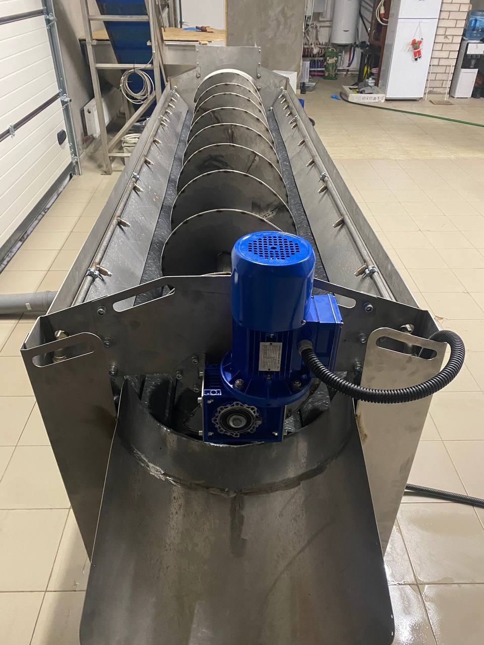 Машина поточной абразивной очистки. Активные валы, длиной 3 метра с возможностью регулировки скорости вращения, машина снабжена шнеком дозирования для управляемой равномерности подачи и управления степенью чистки. Регулируемая подача объёма воды.