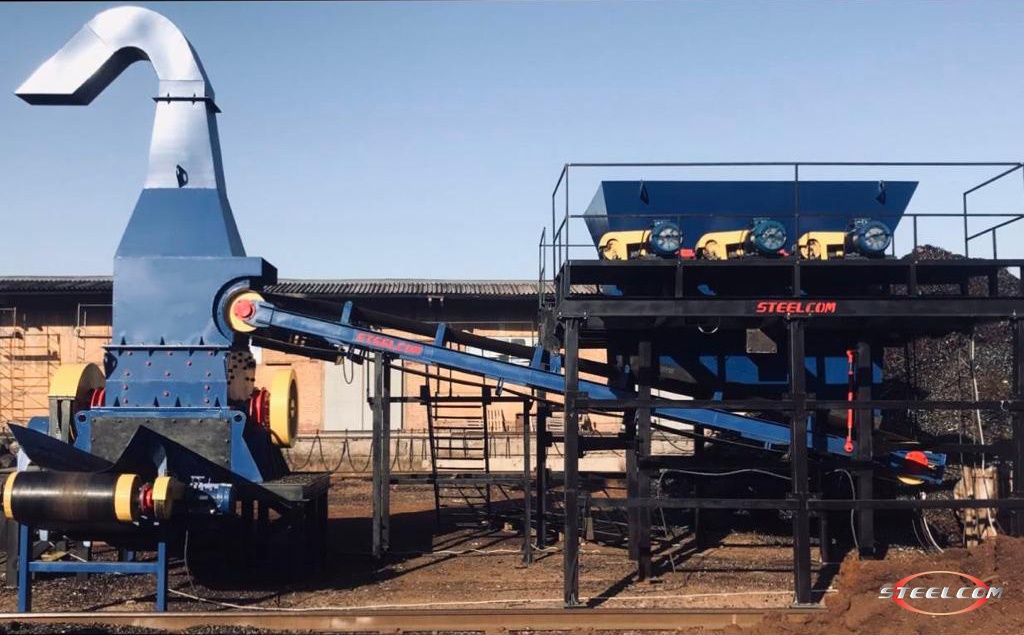 Предварительно раздробленная стружка равномерно высыпается на ленточный конвейер усиленной конструкции с широкой лентой, который подаёт её в загрузочную горловину молотковой дробилки. - Окончательное измельчение: