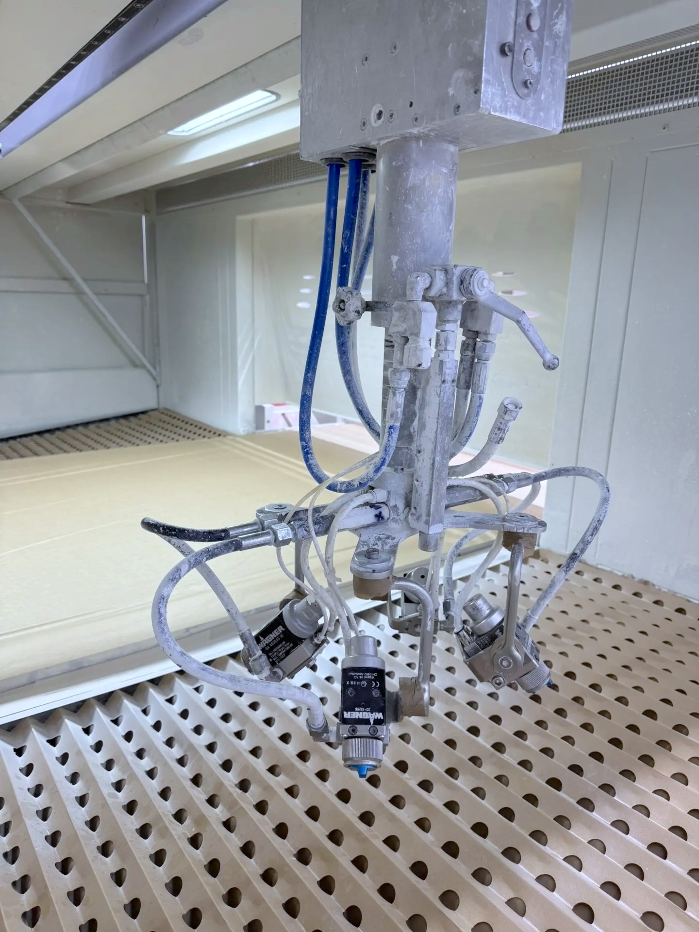 Линия Cefla Prima. В комлекте станция смешивания Wagner TwinControl, 4 пистолета, 2 насоса Wagner Cobra, приточный воздушный пленум. Рабочая ширина до 1300 мм.