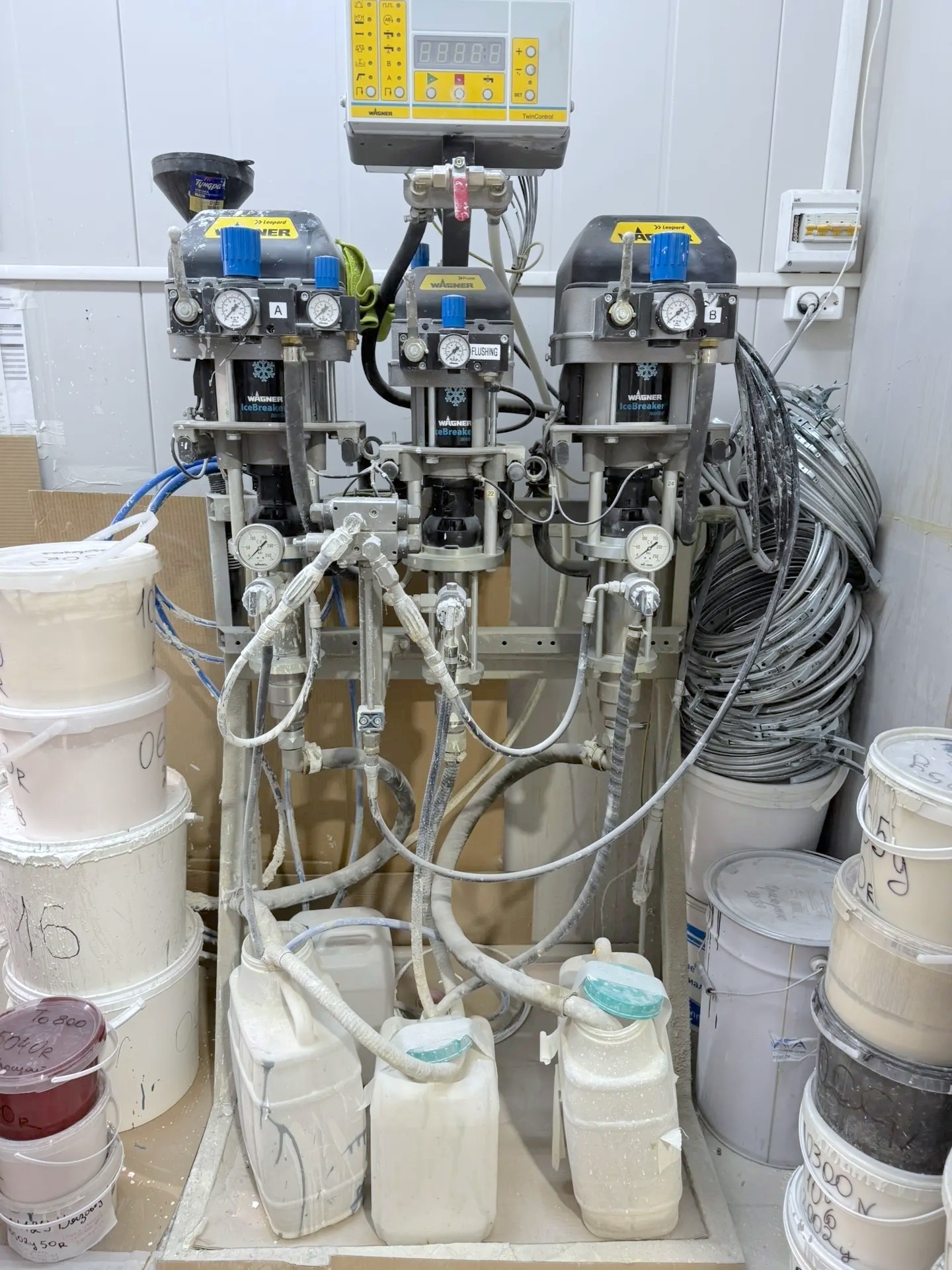 В комлекте: станция смешивания Wagner TwinControl, 4 пистолета Wagner, 2 насоса Wagner Cobra, приточный воздушный пленум