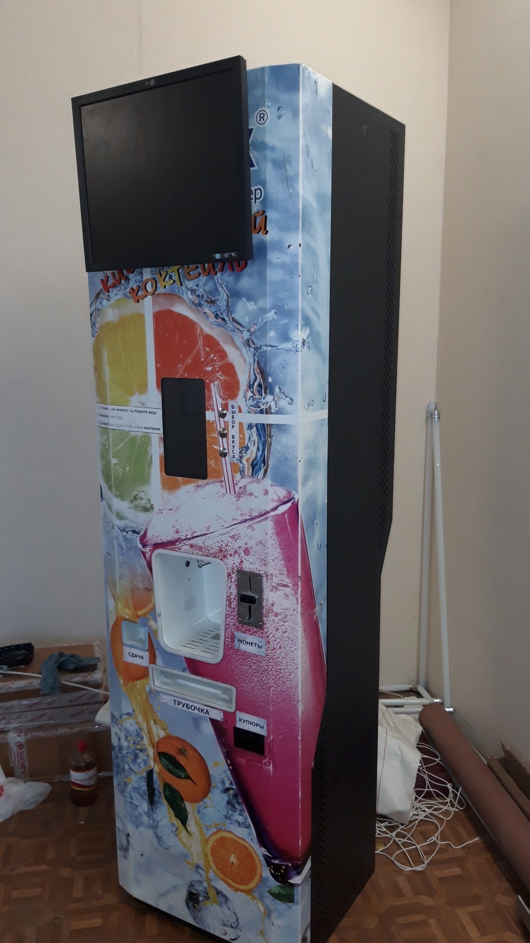 Монитор на вендинговом автомате, может показывать любую рекламу, какую вы загрузите. Монитор подключен к отдельному компютеру.