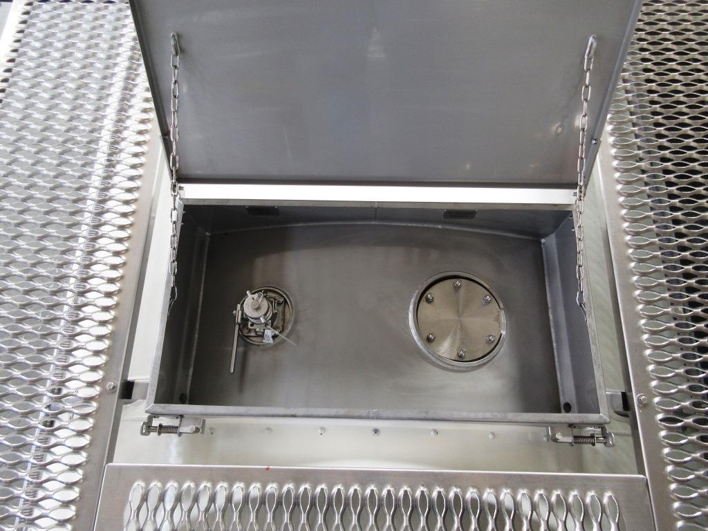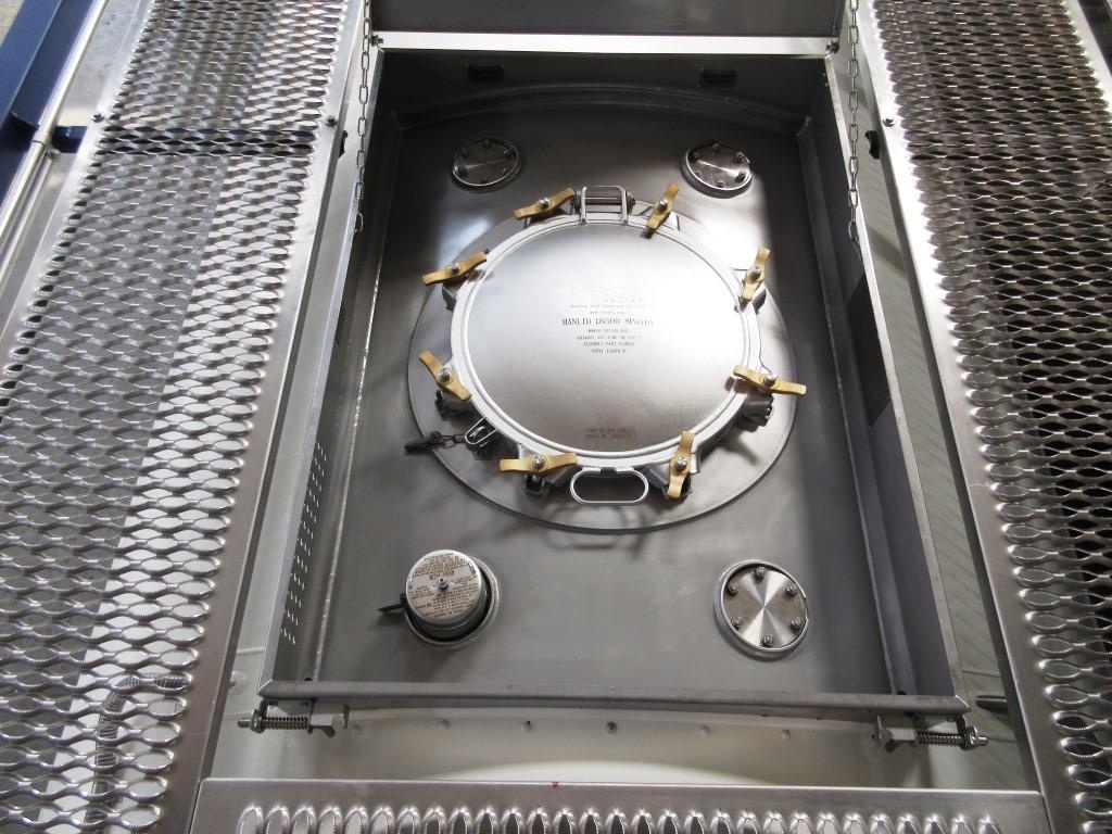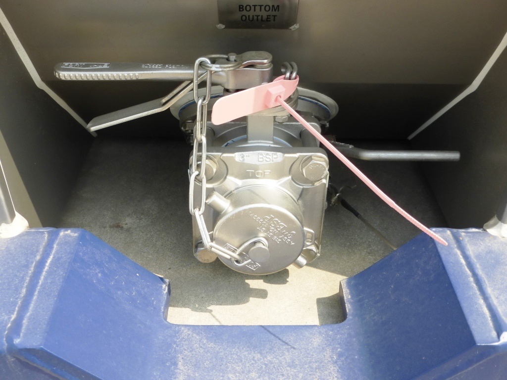 Нижнее устройство слива (налива) груза Последовательно установленные внутренний 3” 45° донный клапан и 3” зажимной поворотный кран (наружный клапан) и выходной патрубок с резьбой 3"BSP и резьбовой крышкой, смонтирован на вварном фланце