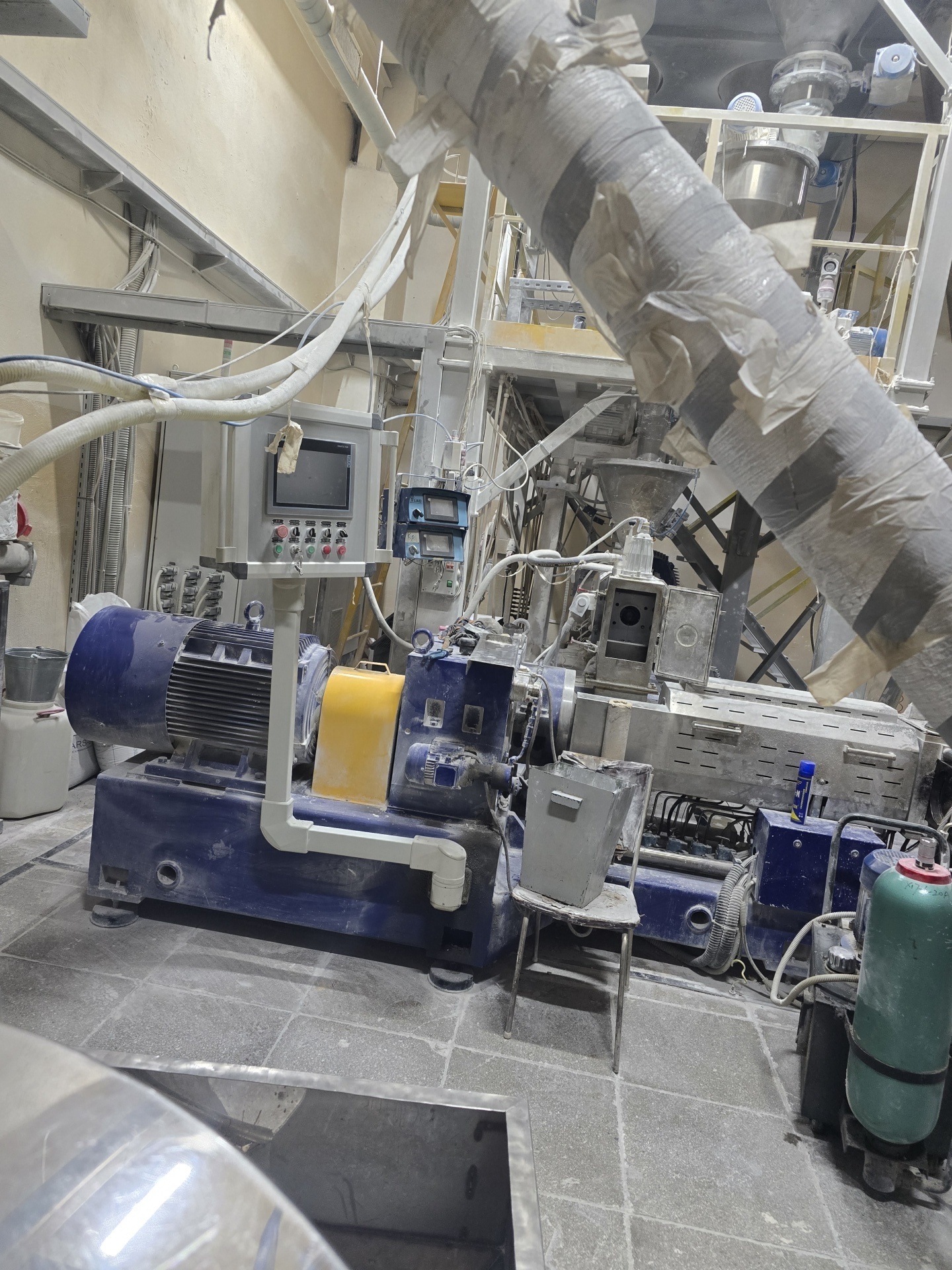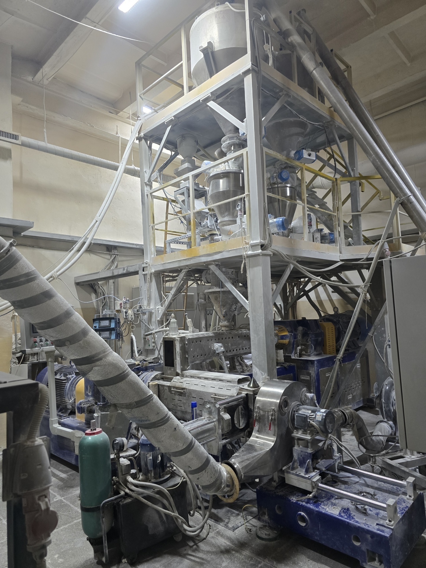 Двухстадийная линия на основе осциллирующего экструдера. Позволяет работать с минимальной деструкцией полимера (можно работать с ПВХ). Установлены весовые дозаторы. Есть фасовочное оборудование для упаковки в мешки под запайку.