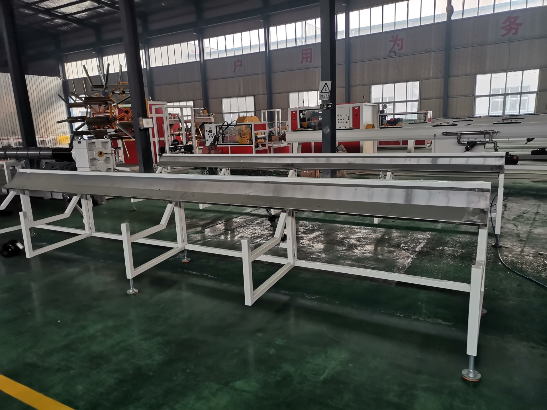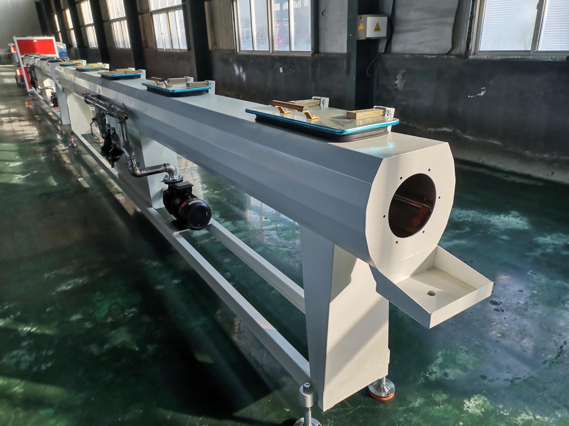 Вакуумно-формовочная камера (распылительная камера): основное оборудование. Внутри находится вакуумная среда, заготовка трубы плотно прижимается к калибровочной втулке за счет отрицательного давления, а внешняя стенка быстро охлаждается путем распыления большого количества охлаждающей воды. Вакуумная формовочная коробка