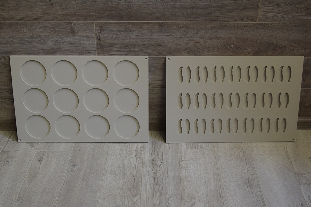 Форма состоит из двух частей: верхняя перфорированная половина и нижняя подложка. Толщина верхней половины задает толщину получаемого изделия.