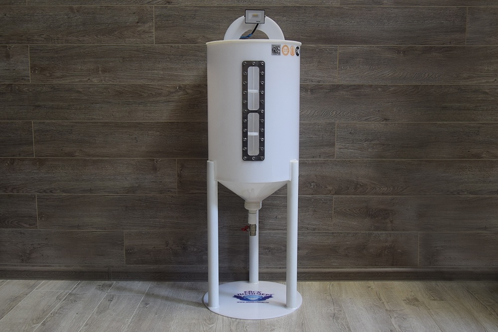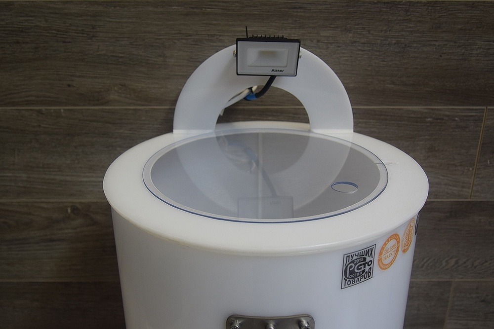 Инкубатор состоит из ёмкости с конусным дном, выполненной из пищевого полипропилена. Ёмкость оснащена смотровым окном, краном и крышкой.