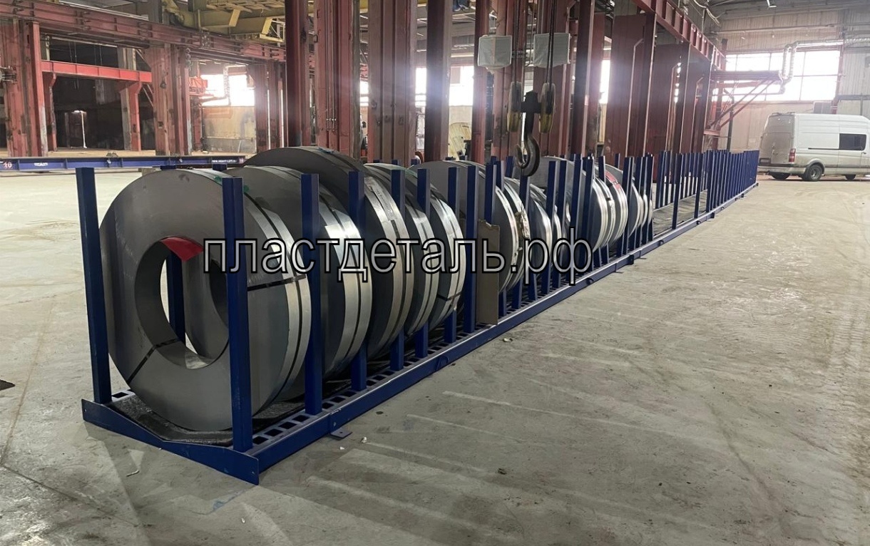 - Конструкция представляет из себя стальную раму с вертикально расположенными стойками, которые позволяют безопасно складировать штрипс в вертикальном положении и забирать в производство необходимый рулон штрипса.
