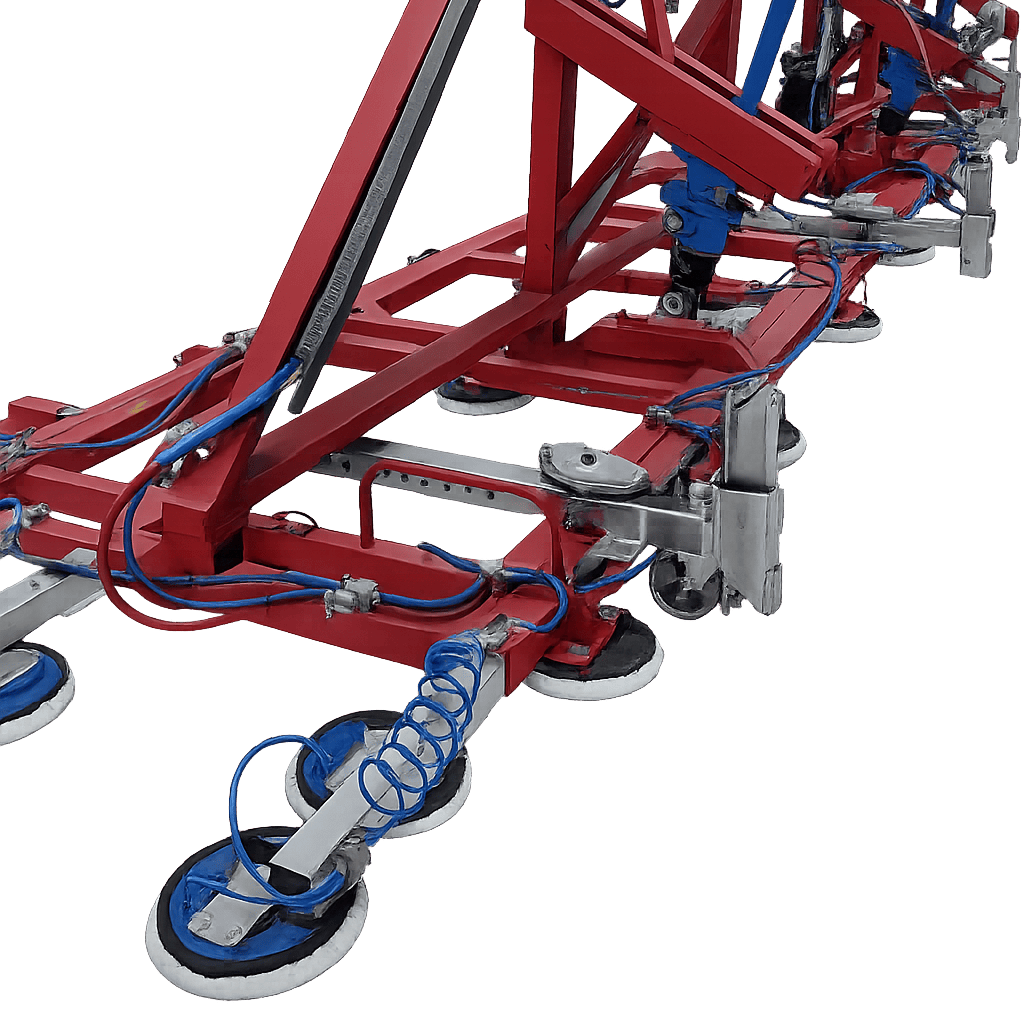 - Гибкая конфигурация: присоски могут перемещаться по поперечной балке и индивидуально перекрываются с помощью шарового крана под конкретный размер листа.