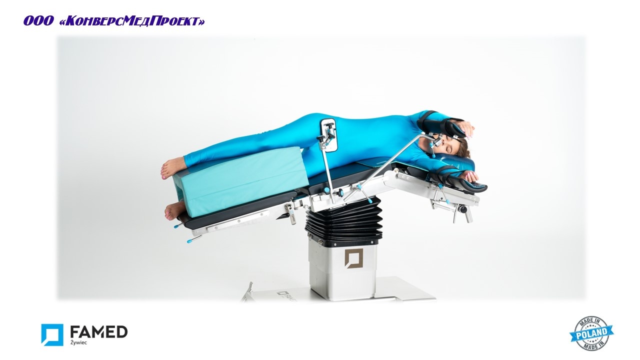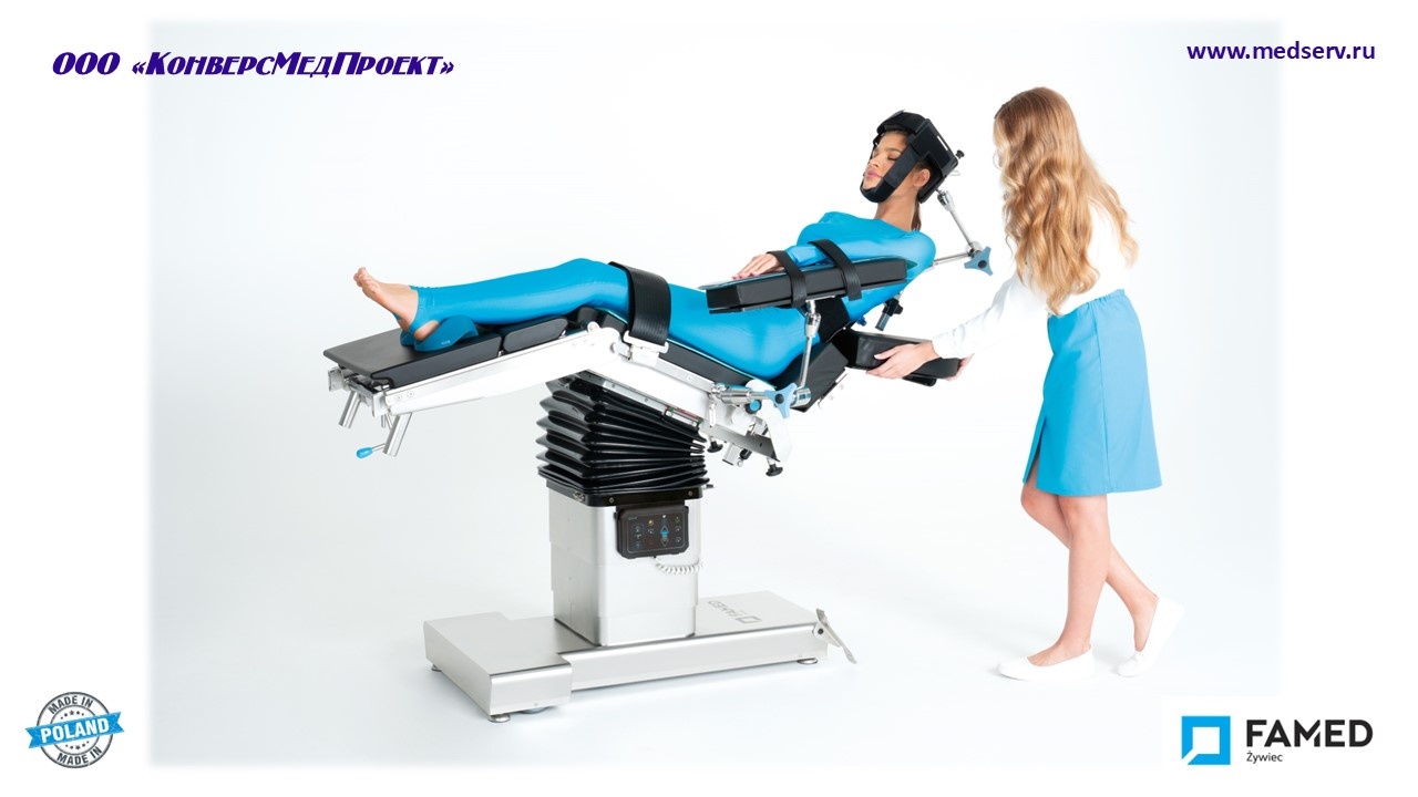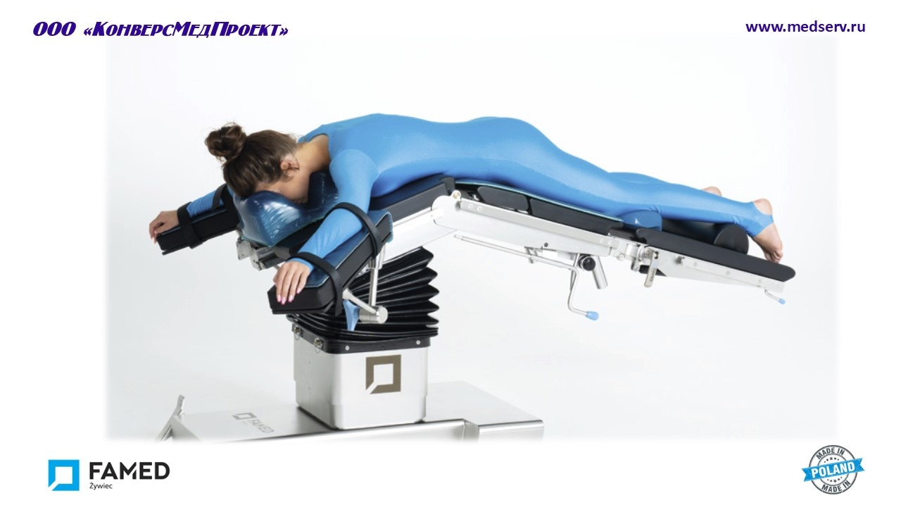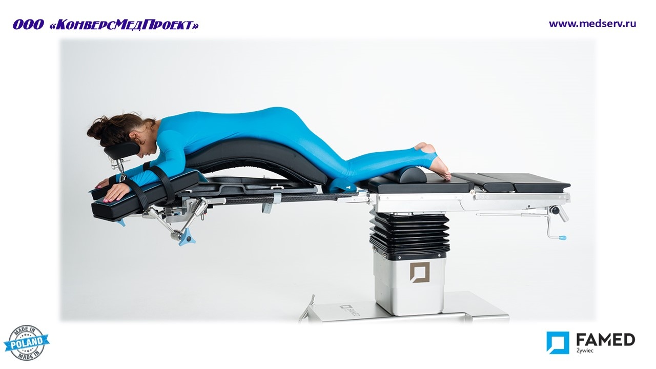 Стол оснащен современной электроникой, позволяющей осуществлять высокоточное позиционирование пациента. Что особенно важно при кропотливых операциях и сопряжения с С-дугой.