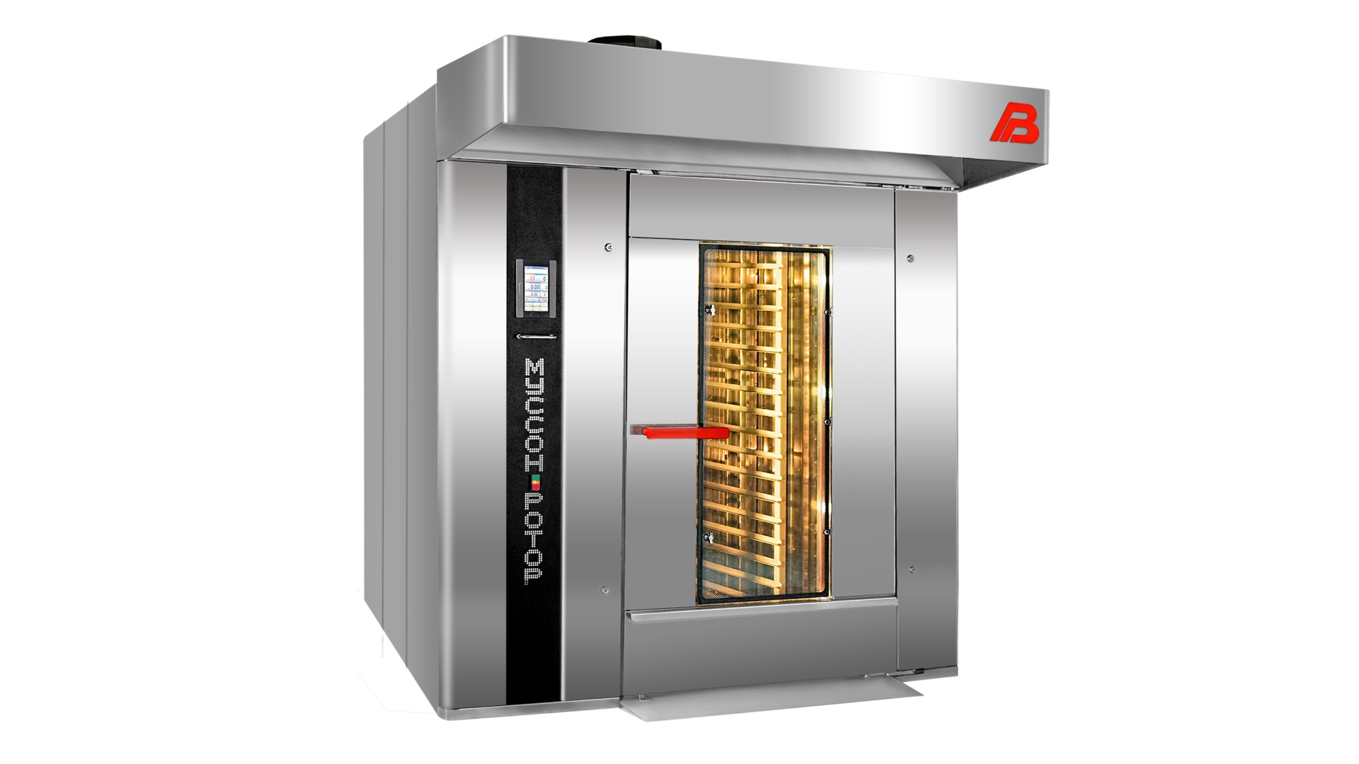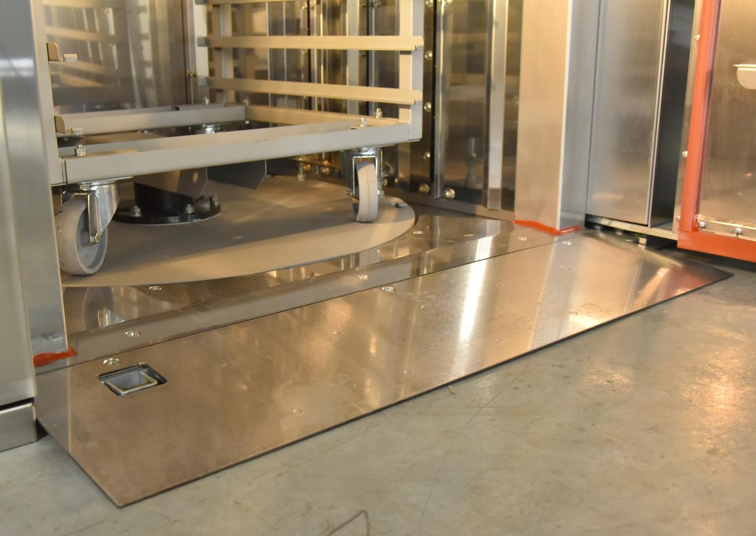 - Верхний привод вращения стеллажной тележки, низкий порог пекарной камеры и короткий пандус минимизируют встряску теста при закатывании тележки.