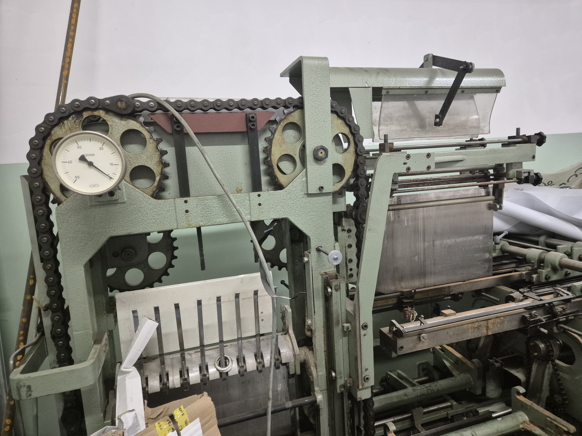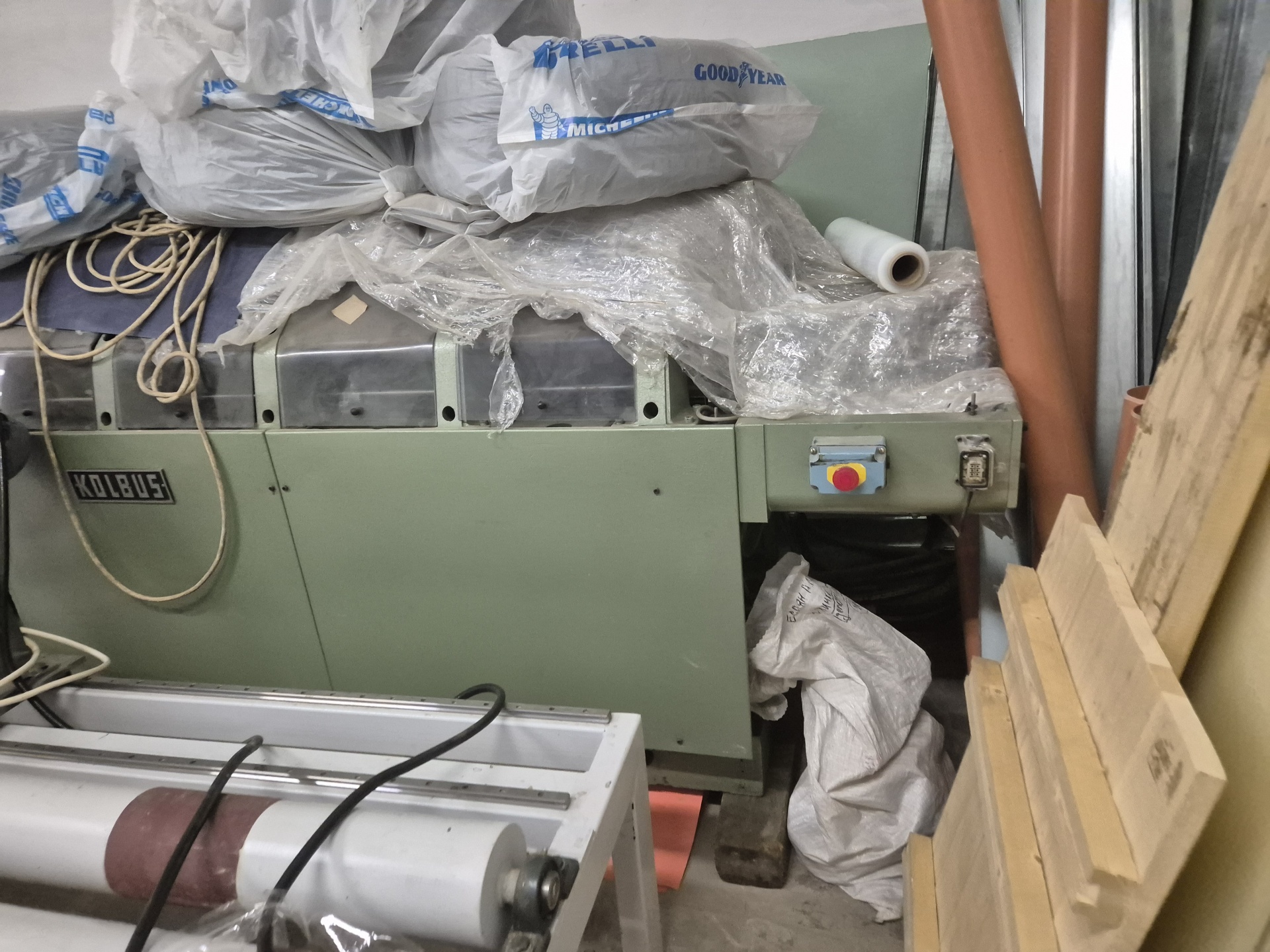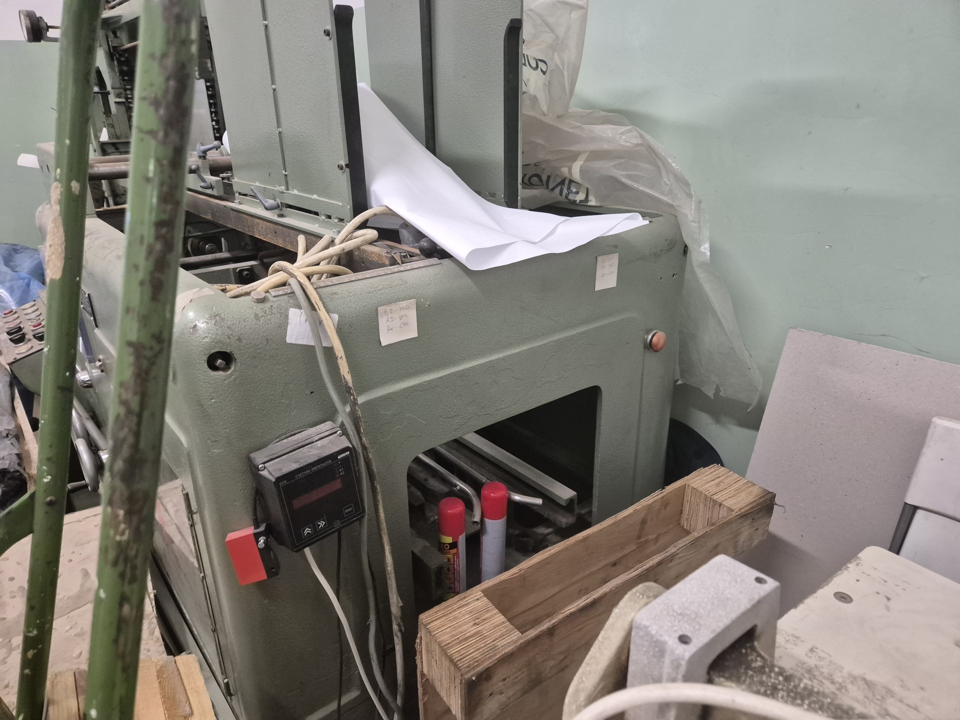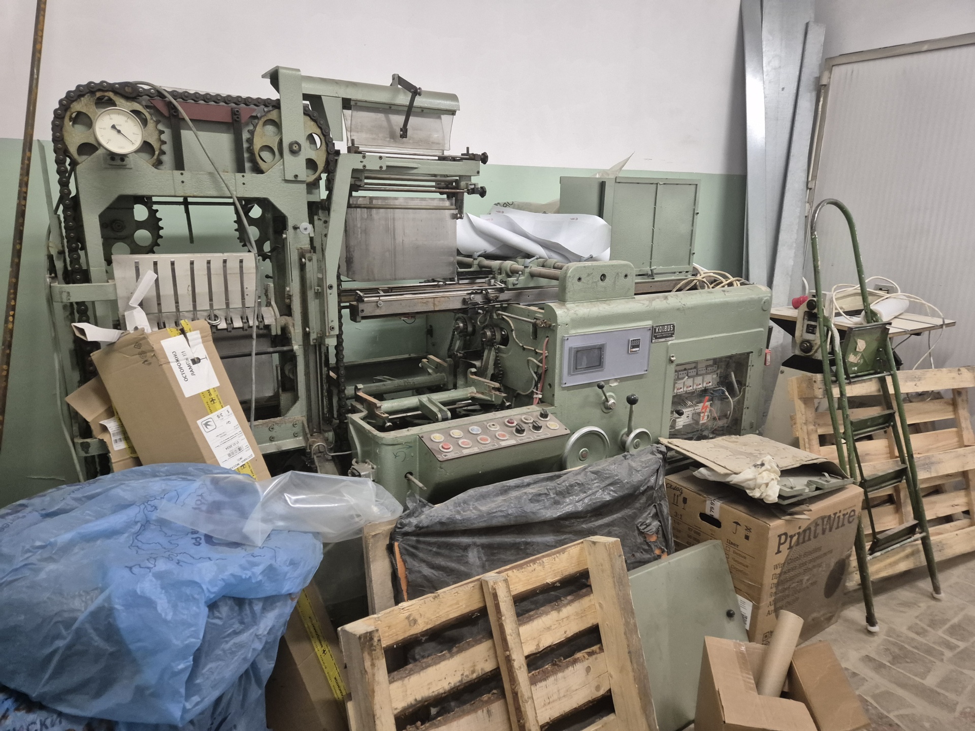 Линия Kolbus EMR 458(1972 г) состоит из: 1. Подача блока автомат (самодельная). 2. Штатная подача блоков. 3. Штатный самонаклад обложек. 4.Книговставочная секция. 5. Транспортер. 6. Пресс штриховка. В данный момент разобрана - в теплом складе.