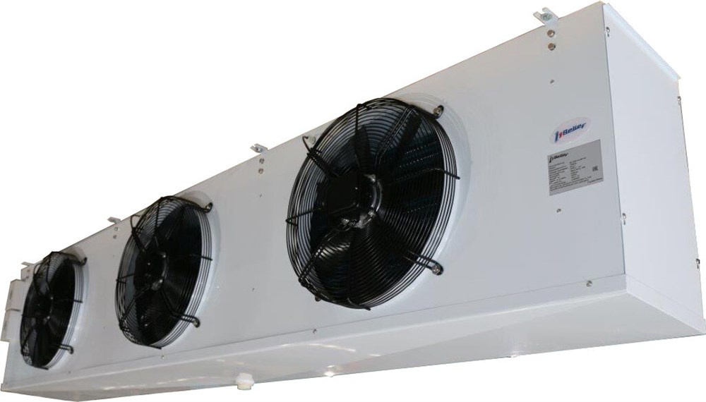 Воздухоохладитель кубический новый, подходит для среднетемпературных (+5/-5С) и низкотемпературных (-18/-25С) камер, площадь теплообмена 120м2, шаг ламели 7мм, 3 вентилятора 500мм, мощность электрооттайки 4кВТ. Холодопроизводительность 31,2кВт при -8кипения, 23,4квт при -25кипения.