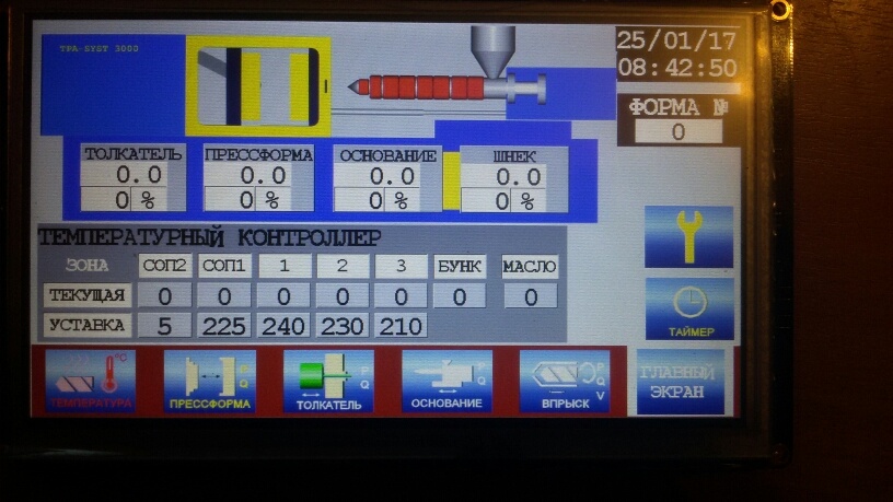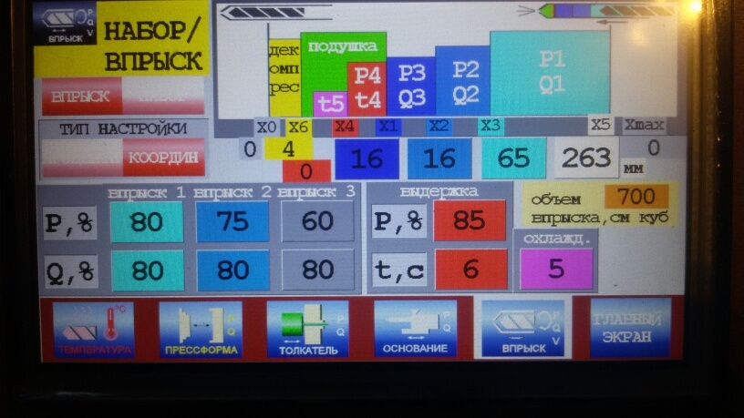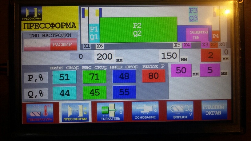 С сенсорного дисплея производится настройка параметров и режимов литья. Программой предусмотрено двухступенчатое управление эжектором с возможностью повторных выталкиваний, 4 канала управления пневмотолкателями, 4-ех зонное движение прессформы, 3-ех зонный впрыск, интрузия, срабатывание толкателей по координате ПФ, отвод ПФ при срабатывании защиты ПФ и многое другое. Прорабатывается программа управления под конкретный ТПА по гидросхеме.