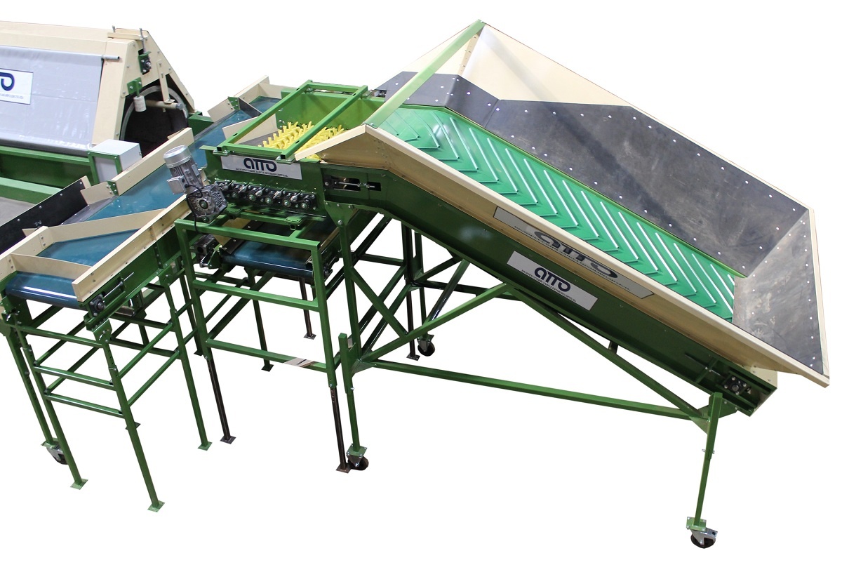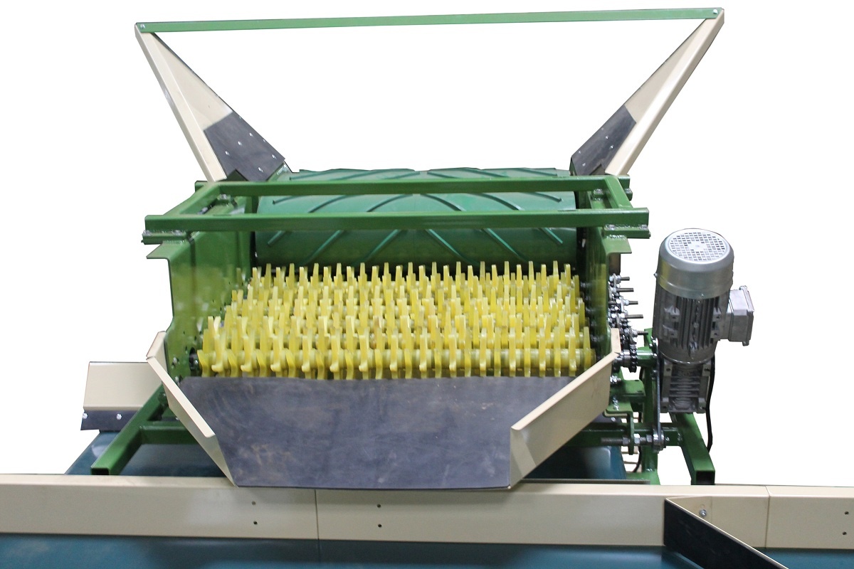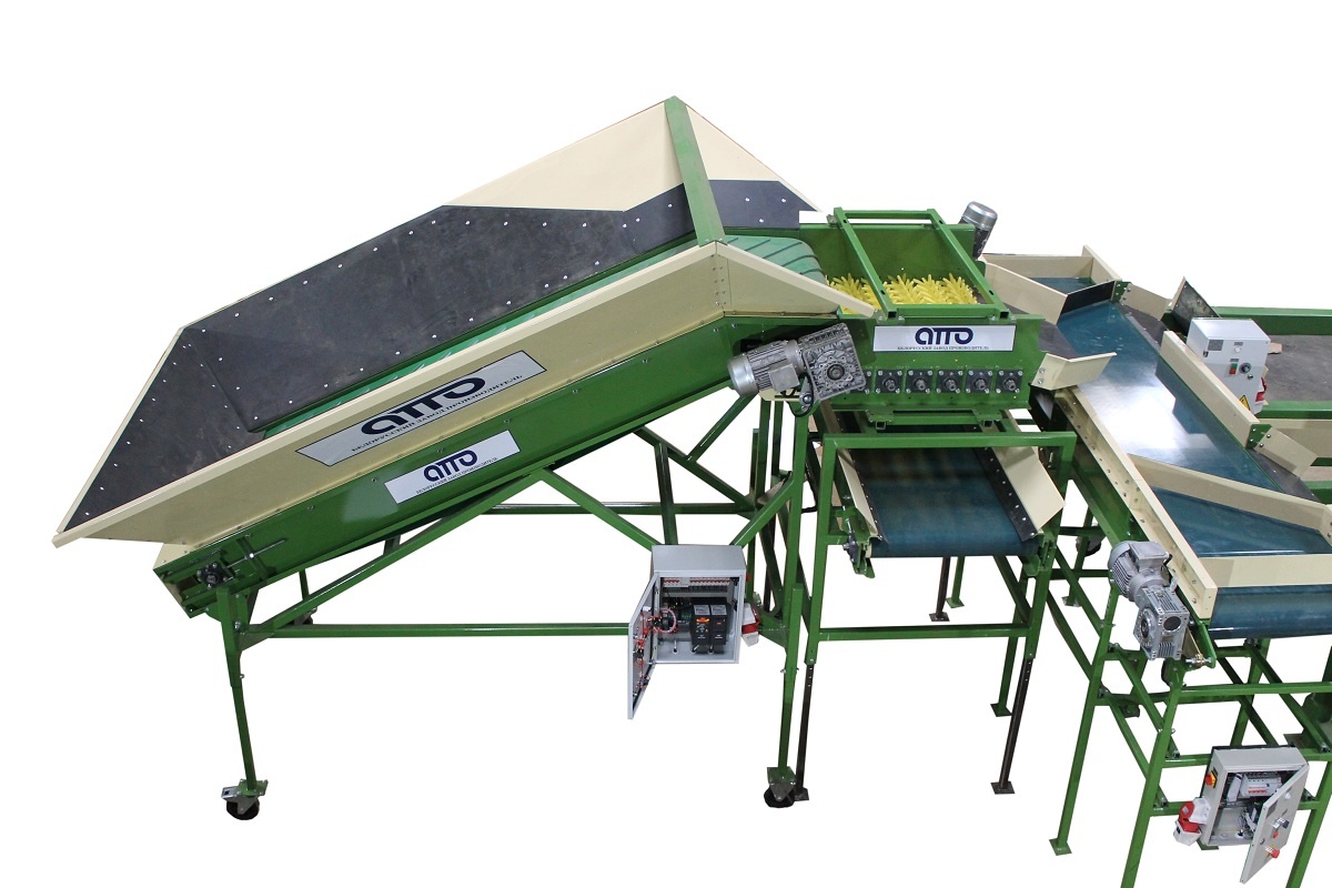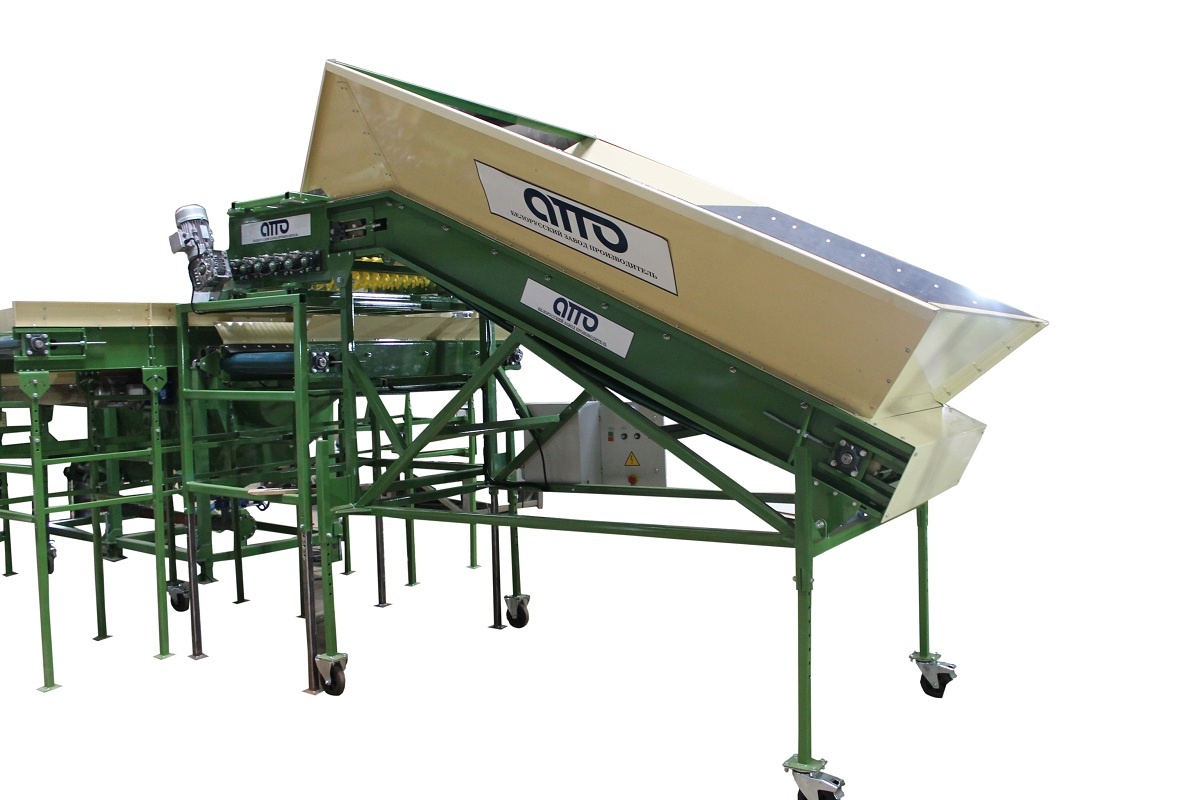 Бункер приемный для картофеля и овощей в комплекте с установкой для отбивки от земли КЛП-2 - предназначен для приёма овощей и равномерной и непрерывной подачи их далее по технологическому циклу-линии. Приемный бункер устанавливается перед установкой сухой очистки, моечной установки, роликовым инспекционным конвейером (сортировочный стол), установки калибровочной и т.д. На приемной бункере установлен частотный преобразователь для регулировки скорости движения ленты.