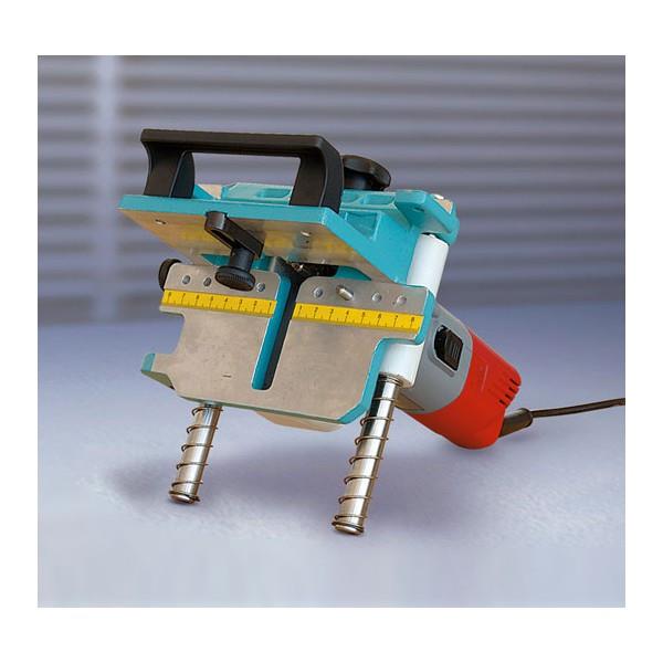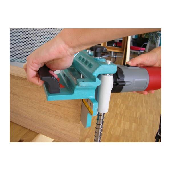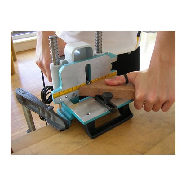 Ручной присадочный фрезер крепят винтами или струбцинами к рабочему столу. Позиционируют заготовку по шкале и штифтовому ограничителю.