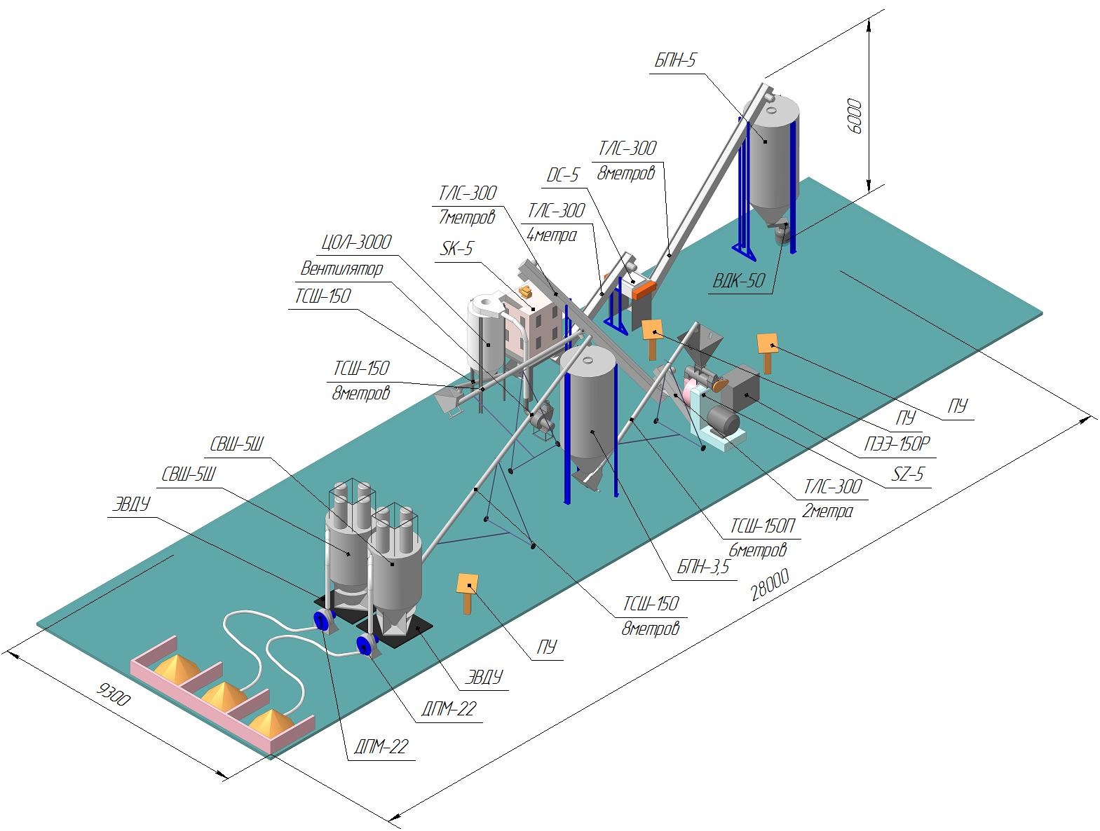Комплекс комплектуется всем необходимым для процесса: пресс гранулятор, охладитель гранул, просев, вентилятор, циклон, фасовка и т. д.