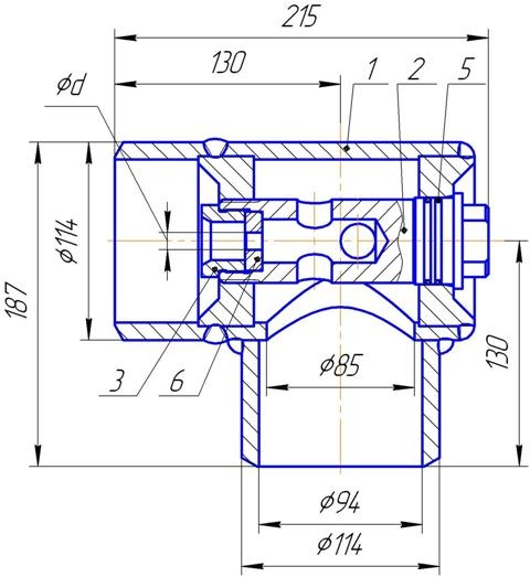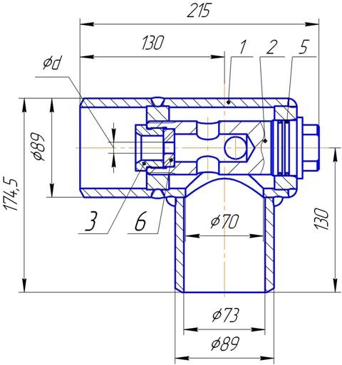 Штуцерная камера Н05.042 состоит из сварного корпуса 1, в который вворачивается вставка 2, подсобранная с дросселем 6 из комплекта дросселей при помощи гайки 3. Относительно корпуса вставка уплотняется двумя резиновыми кольцами 5 по ГОСТ9833-73. Дроссель 6 имеет калиброванное отверстие d, диаметр которого выбирается заказчиком. Герметизация корпуса 1 штуцерной камеры обеспечивается приваркой отводов камеры к трубной обвязке