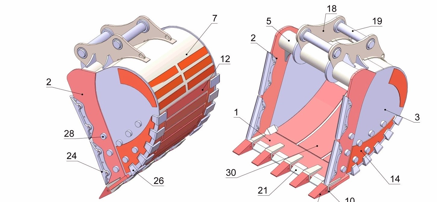 Представляем улучшенную усиленную конструкцию скального ковша объемом 1,5 м3, состоящую из более чем из 30 деталей: