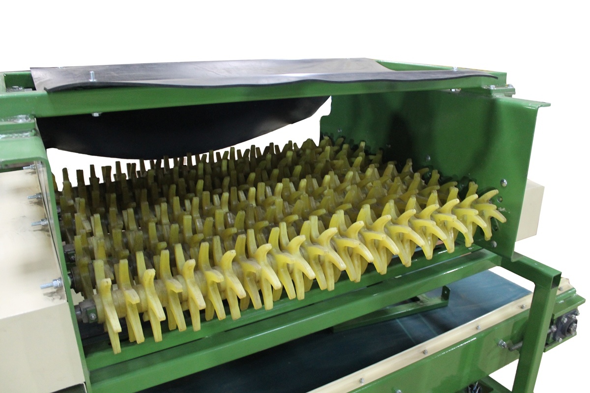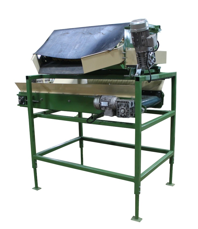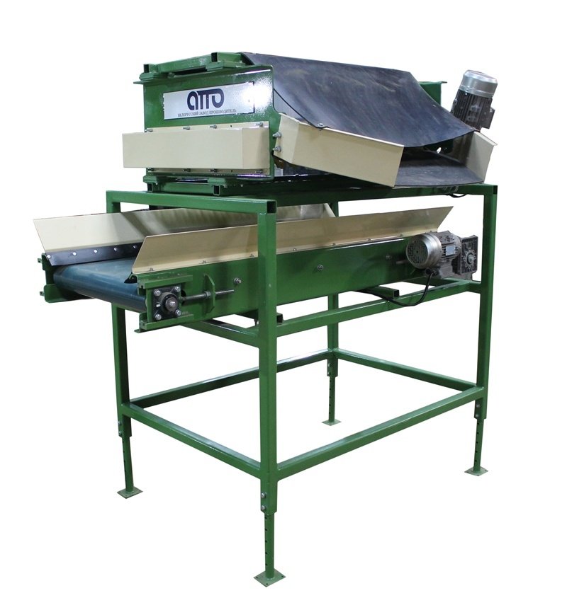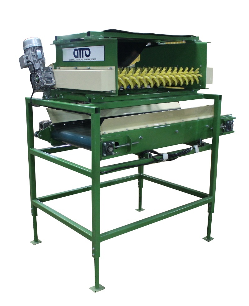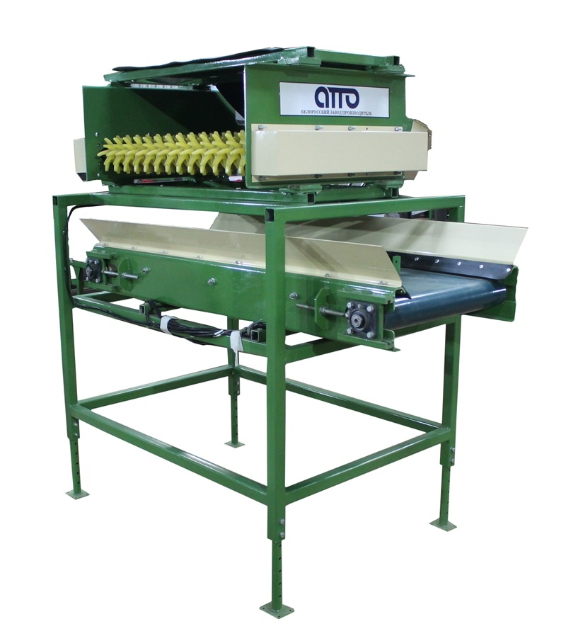 В комплектацию установки отбивки от земли входит так же отводящий ленточный транспортер для отвода земли в контейнера (ящики). Транспортер реверсивный, может работать как в левую сторону, так и в правую.