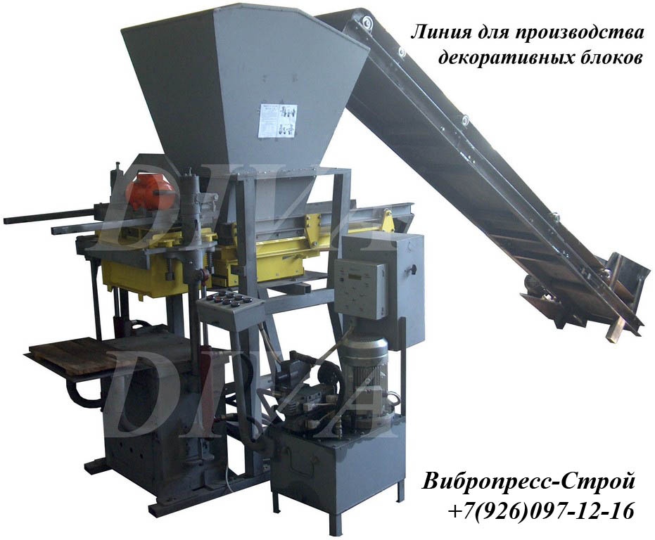 В состав линии для производства декоративных колотых блоков входит растворосмеситель принудительного действия горизонтальный сб-97 для приготовления жесткой бетонной смеси, вибропресс для стационарного изготовления декоративных колотых блоков вп 600 М, вп 21, вп 41 или вп 61. Колочный пресс кп-52 для раскола декоративных блоков. По желанию заказчика линия для производства декоративных блоков может быть укомплектована наклонным ленточным транспортером для подачи готовой бетонной смеси к вибропрессу, гидравлическим загрузчиком ВПЗг-83 для загрузки и дозирования бетонной смеси в вибропресс а так же виброситом для просеивания сыпучих материалов поступающих в растворосмеситель.