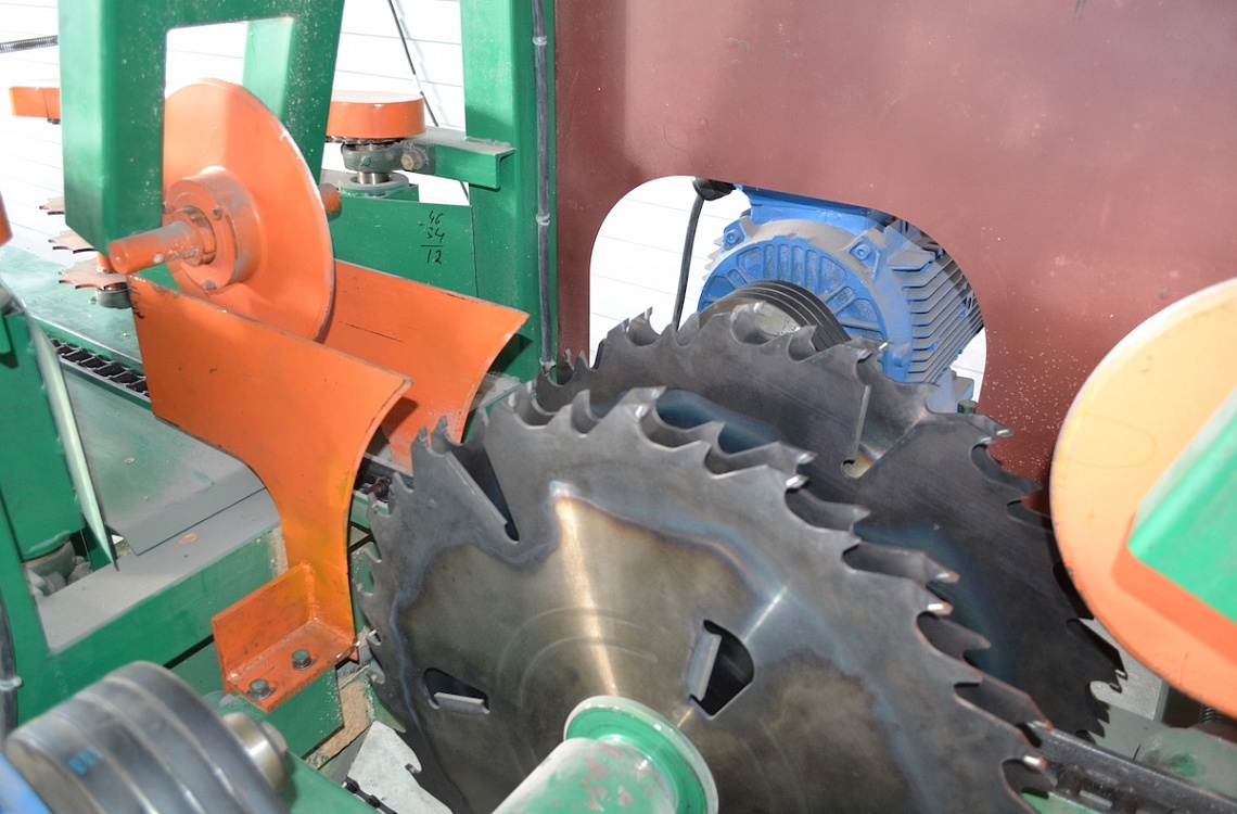 Бревно укладывается по центру стола и обрезается сразу с двух сторон при подаче в пильный блок. Прижим заготовки обеспечивается прижимными дисками по центру - перед заходом в пильный блок и при выходе из него.