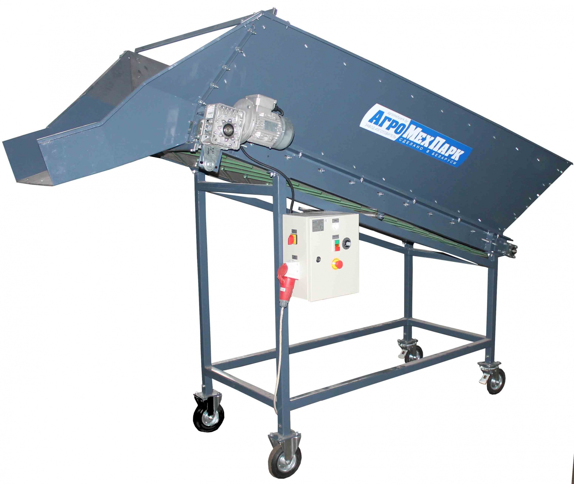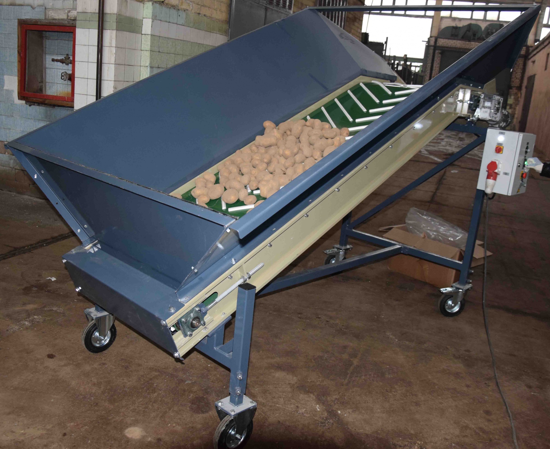 Приемный бункер УПП-1.07 – это устройство, предназначенное для приема и равномерного перемещения овощей: картофеля, лука, моркови, свеклы, других овощей и корнеплодов по технологической линии с функциями приема, загрузки и выгрузки. Прием и загрузка овощей в приемный бункер может происходить в двух режимах: автоматический (при помощи опрокидывателя конвейеров) и ручной (человеком из сеток и мешков).