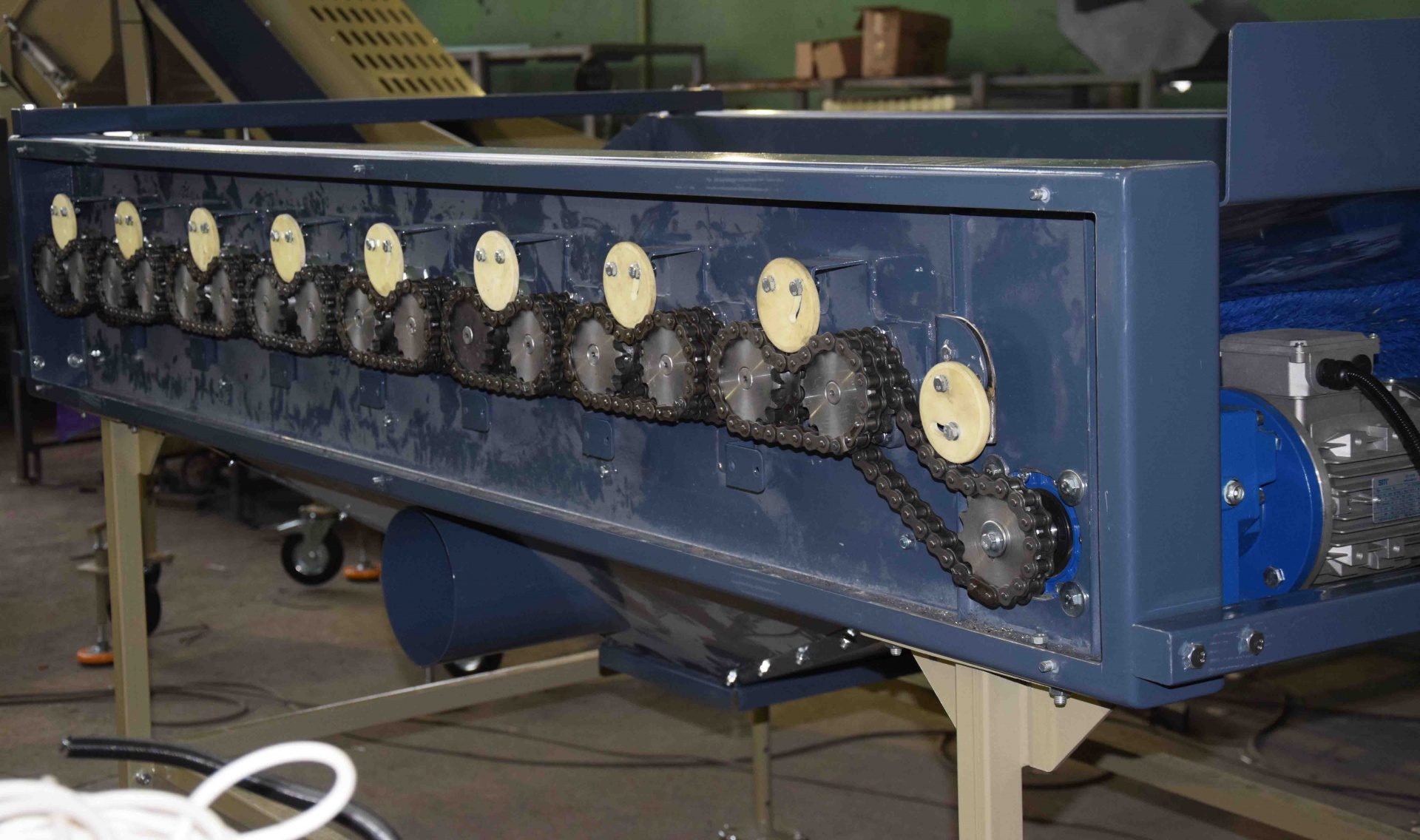 Оборудование сухой очистки овощей и картофеля оснащено вращающимися круглыми капроновыми щетками (16 штук), тщательно очищающими и перемещающими овощи. Над щетками установлен резиновый кожух с целью наиболее эффективной очистки овощей и ограничения образования пыли в помещении. Исходя из типа продукции, скорость вращения очищающих щеток можно регулировать с помощью частотного преобразователя, предотвращая порчу и повреждение овощей.