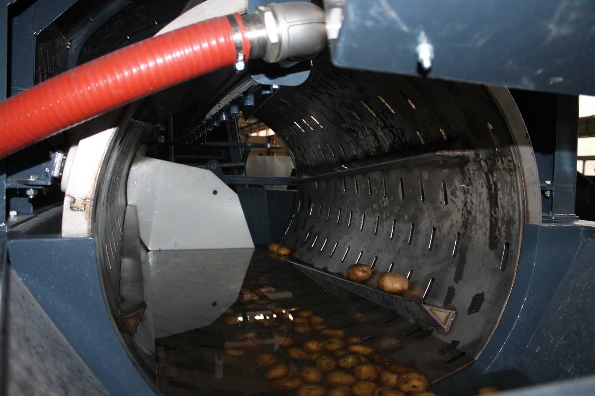 Машина для мойки овощей УМО-БН представлена в виде барабана из нержавеющей стали с непрерывным (проходным) процессом мойки. Очистка овощей происходит путем перемещения продукции во вращающийся барабан, размещенный в наполненной водой ванне, где они соударяются со стенками барабана и друг с другом. В это время в барабан поступают сильные струи воды через систему форсунок, обеспечивающие дополнительную очистку. Отделяющийся мусор и грязь смывается и осаждается на дне ванны через специальные отверстия в барабане, а овощи выталкивают друг друга к отделу выгрузки.