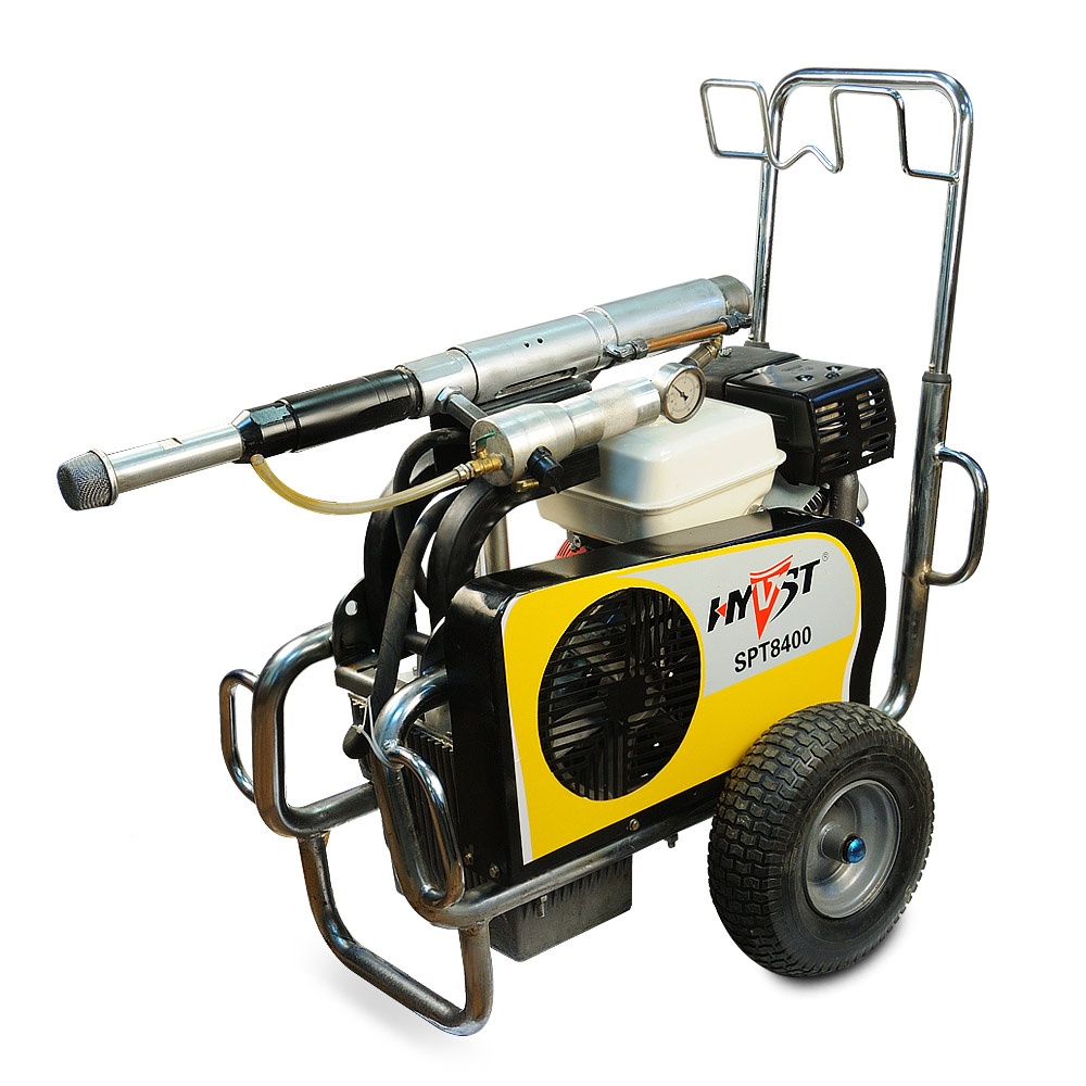 Поршневой, бензиновый, безвоздушный окрасочный аппарат для распыления вязких красок. Окрасочный аппарат собран по дизайну Wagner HeavyCoat 960, и имеет с оригиналам схожую конструкцию. Окрасочный аппарат оснащается бензиновым двигателем Honda, что позволяет работать с данным окрасочным аппаратом как на стройке, так и в "поле". Окрасочный аппарат пригоден для нанесения красок различной вязкости, может использоваться для распыления огнезащитных красок, гидроизоляции, антикоррозионных красок, красок, эмалей и грунтов по металлу. К окрасочному аппарату можно подключить сразу нескольких маляров, что позволяет вдвое увеличить производительность покраски. Окрасочный аппарат оснащается своей гидростанцией, поршень движется от напора гидравлического масла. Поршневой насос имеет три положения, походное -горизонтальное, наклонное для забора краски из специальной бочки, вертикальное для стандартного засасывания краски из евроведра.