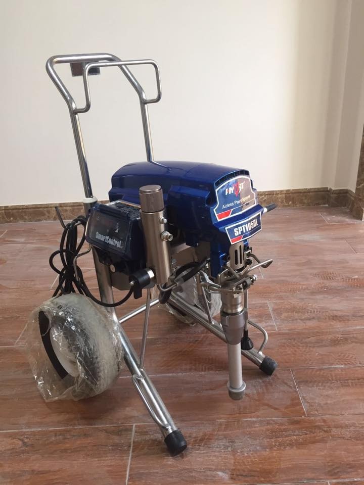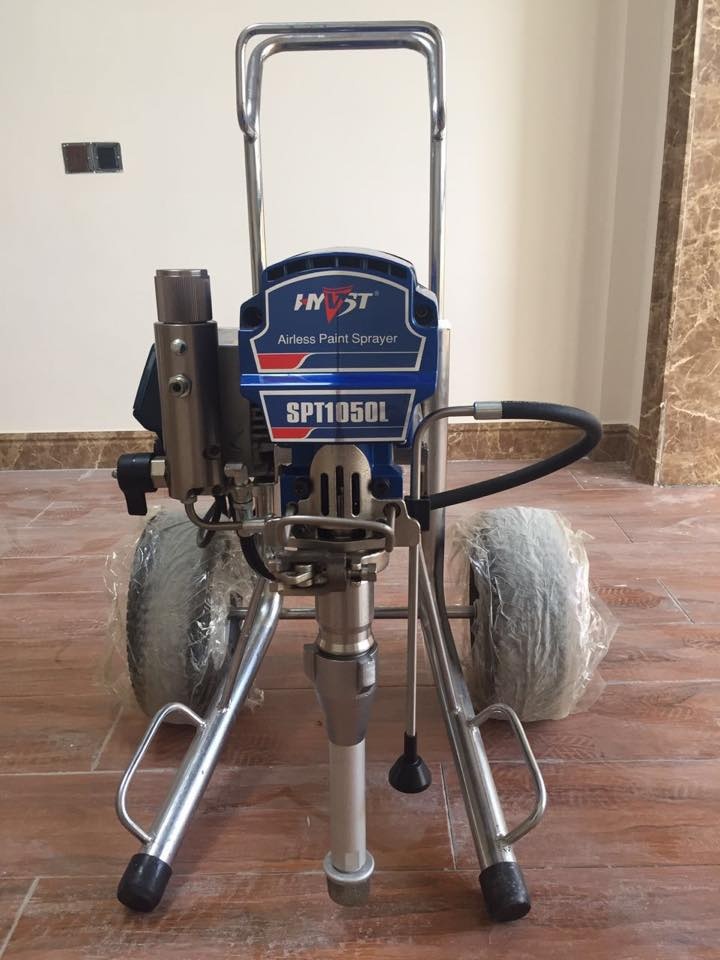 Поршневой безвоздушный окрасочный агрегат HYVST SPT 1050 P, аналог Graco Mark V. Окрасочный ап-парат работает от электрического мотора 220 вольт, предназначен для безвоздушного распыления лако-красочных материалов средней и высокой вязкости. Окрасочный аппарат HYVST SPT 1050 L используют для нанесения огнезащитных красок на металлоконструкции, финишных готовых распыляемых шпатлевок, антикоррозионных красок по металлу, грунтовок и эмалей, красок по дереву, акриловых и латексных красок по стенам и потолкам, фасадных красок. Окрасочный агрегат может работать на двоих маляров одновременно. Краску засасывает из ведра с помощью длинного погружного насоса. Отличием модели от HYVST 1050 P от HYVST 1050 L является наличии барабана для сматывания шлангов высокого давления.